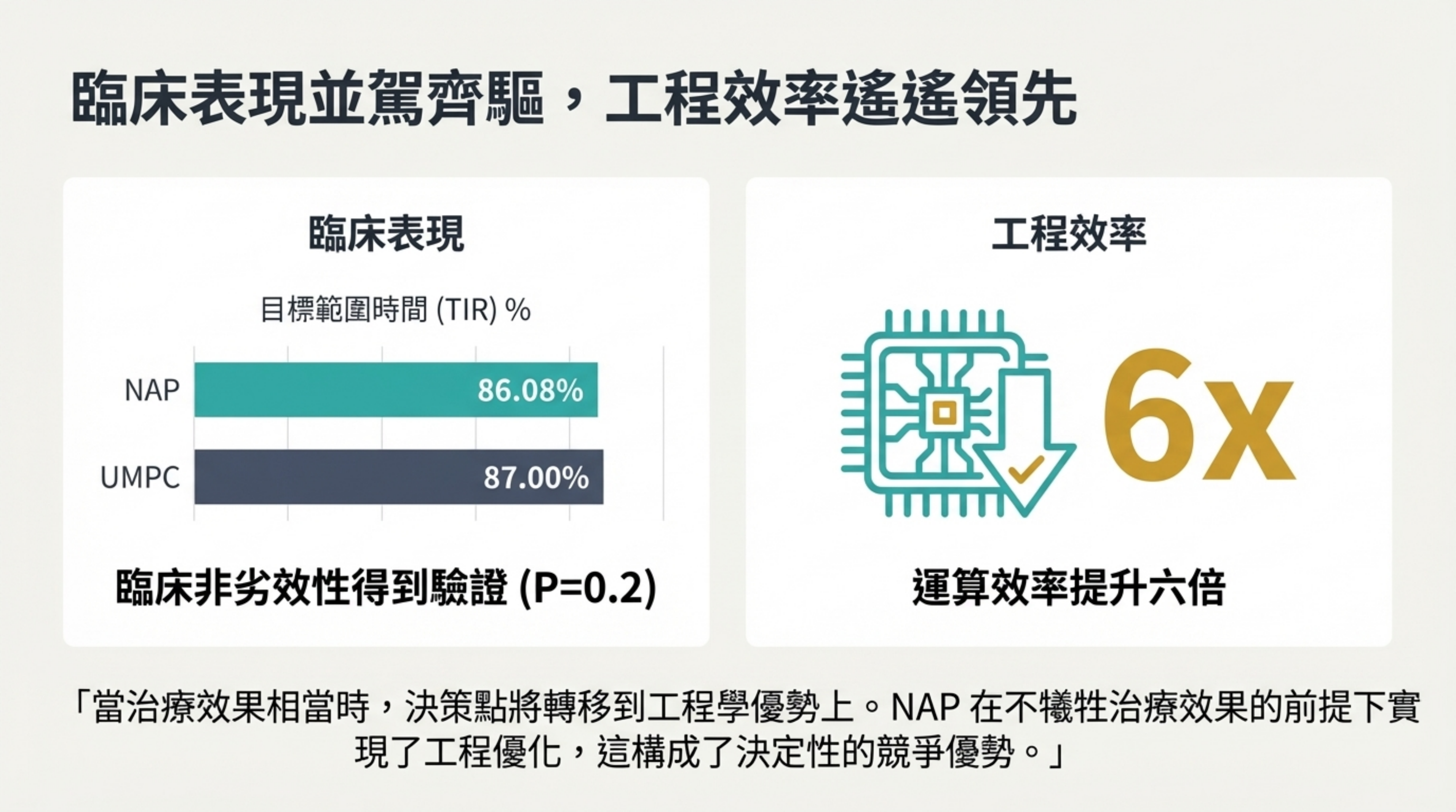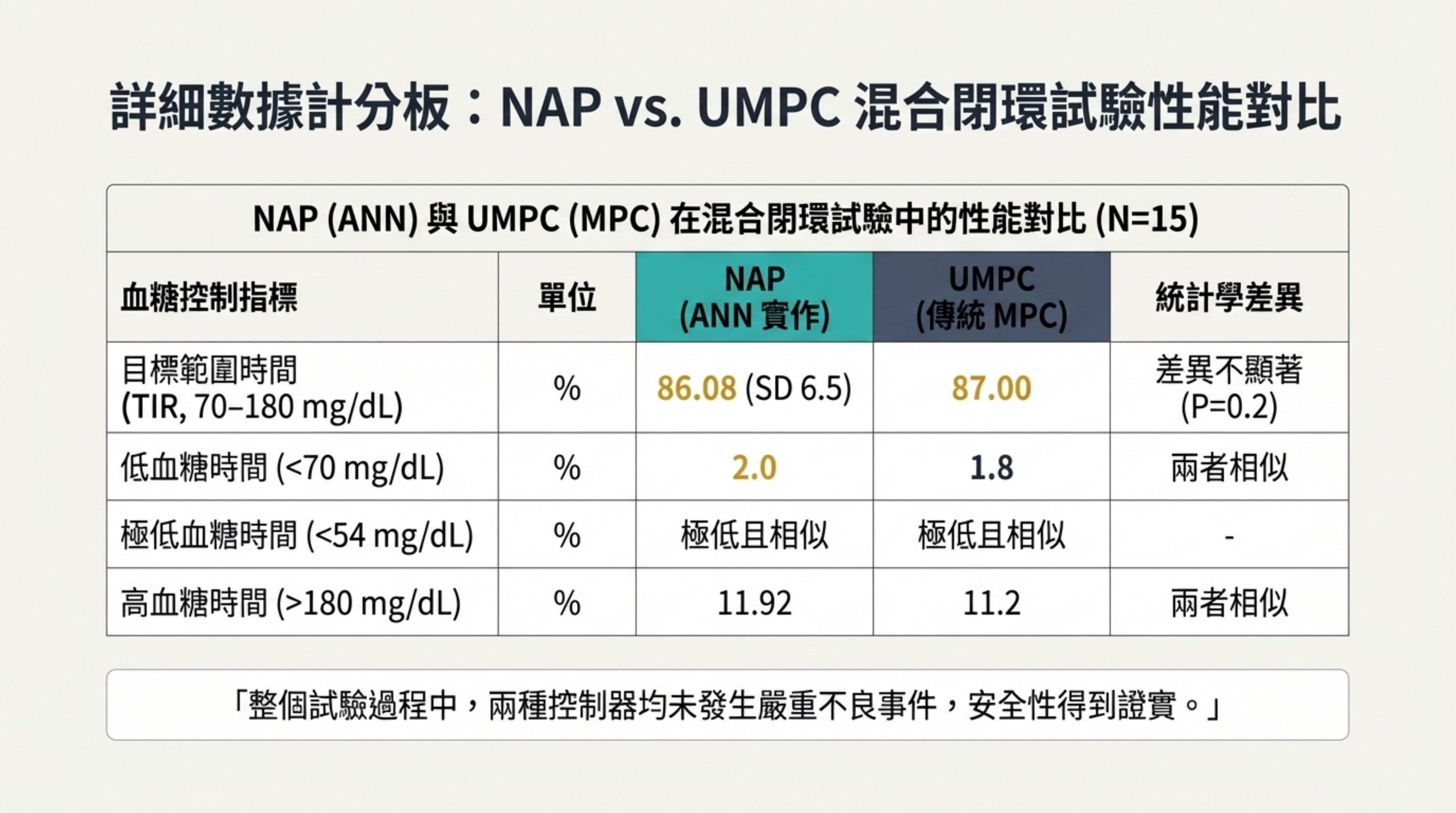 安全性: 整個試驗過程中,兩種控制器均未發生嚴重不良事件 。這張表為 NAP 作為醫療級演算法提供了堅實的數據支撐。