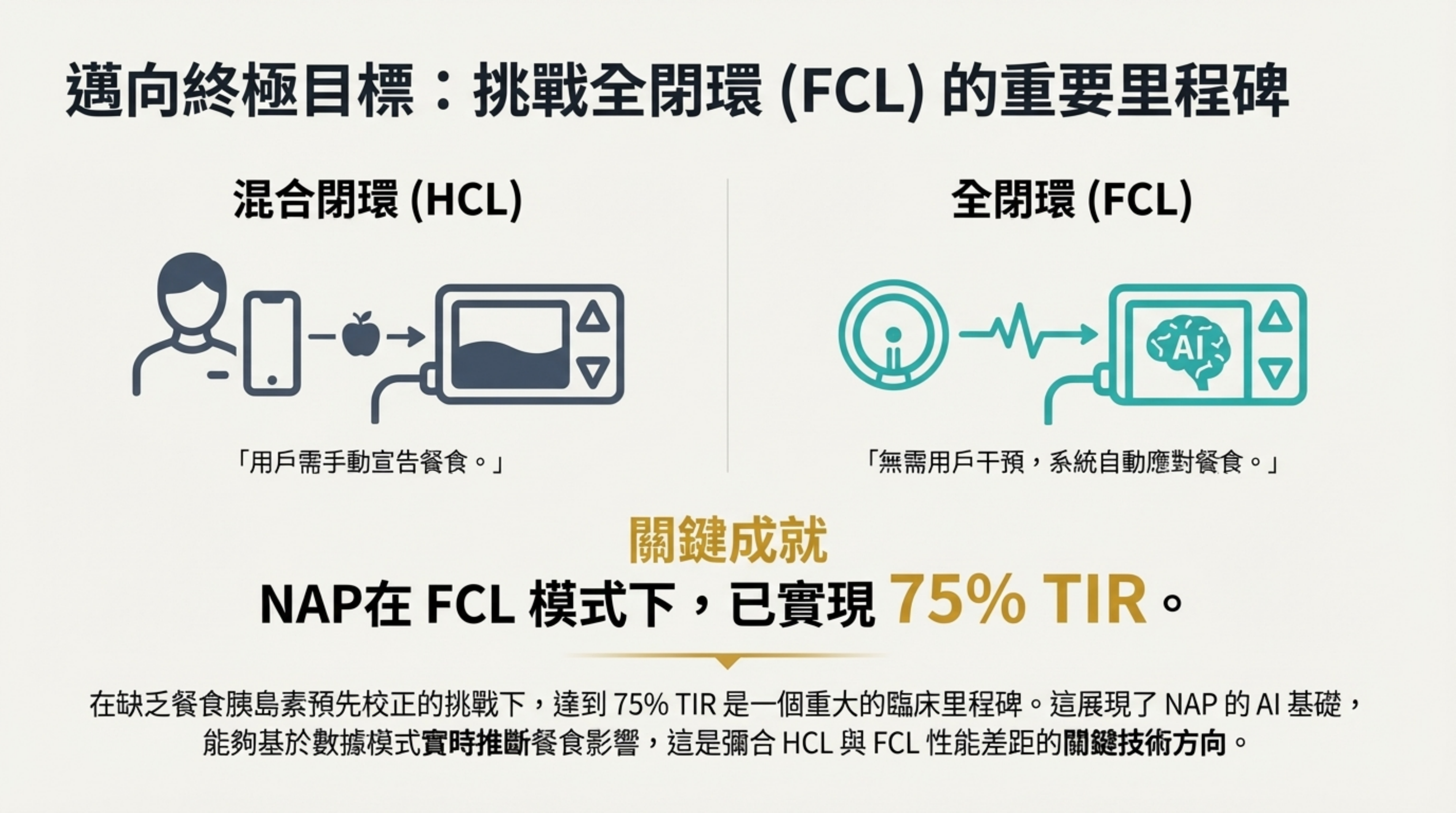 關鍵成就: NAP 在 FCL 模式下(無餐食宣告)仍實現了 75% 的 TIR 。這是一個重大里程碑,證明了 NAP 基於 AI 的模式識別能力,能夠實時推斷餐食影響並進行補償,縮小了 HCL 與 FCL 之間的性能差距 。