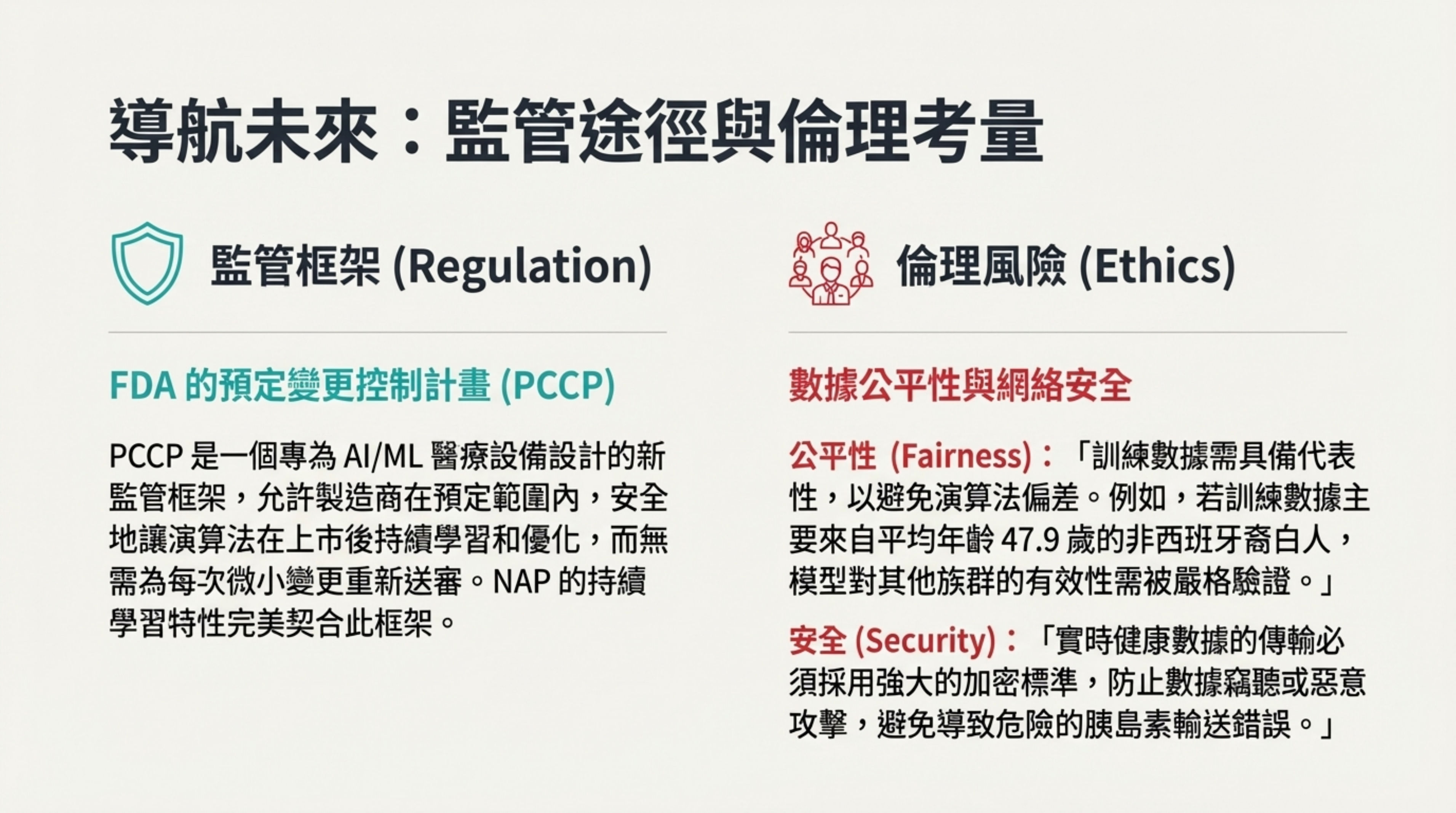 監管 (FDA PCCP): 為了適應 AI 持續學習的特性,需採用 FDA 的「預定變更控制計畫(PCCP)」。這允許製造商在預定範圍內對演算法進行自動優化,而無需每次微調都重新送審