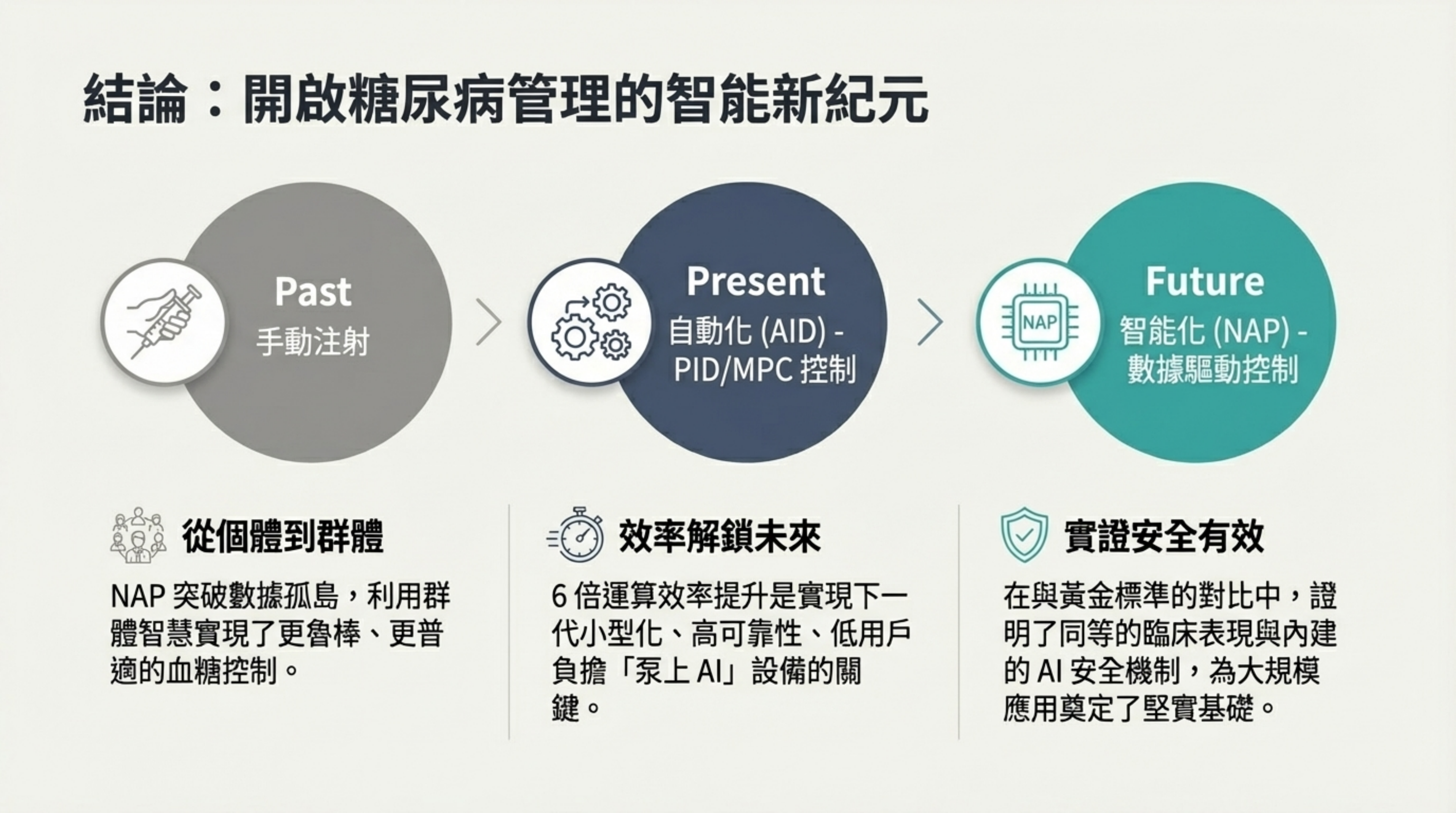 未來優勢 (NAP Inside): 由於運算負載低,演算法可以直接在胰島素泵的晶片上運行(On-pump AI) 。這消除了通訊延遲風險,延長了電池壽命,並使設備能做得更小(微型化),顯著降低用戶負擔 。