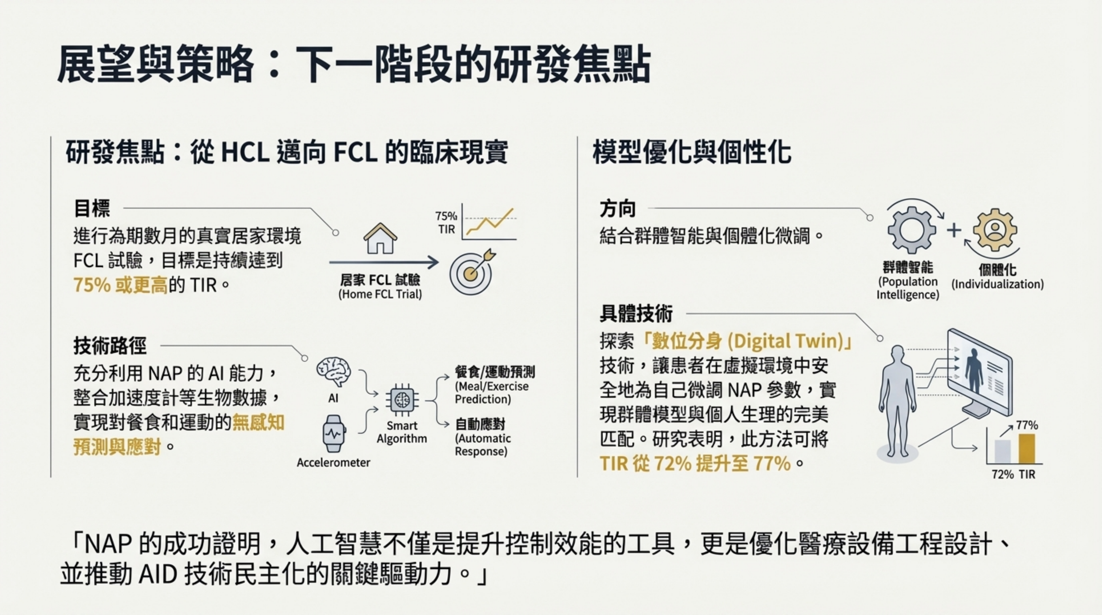 邁向 FCL: 利用 NAP 的 AI 能力整合加速度計等生物數據,實現對餐食和運動的「無感知」預測與應對,目標是在居家 FCL 試驗中維持 75% 或更高的 TIR 。