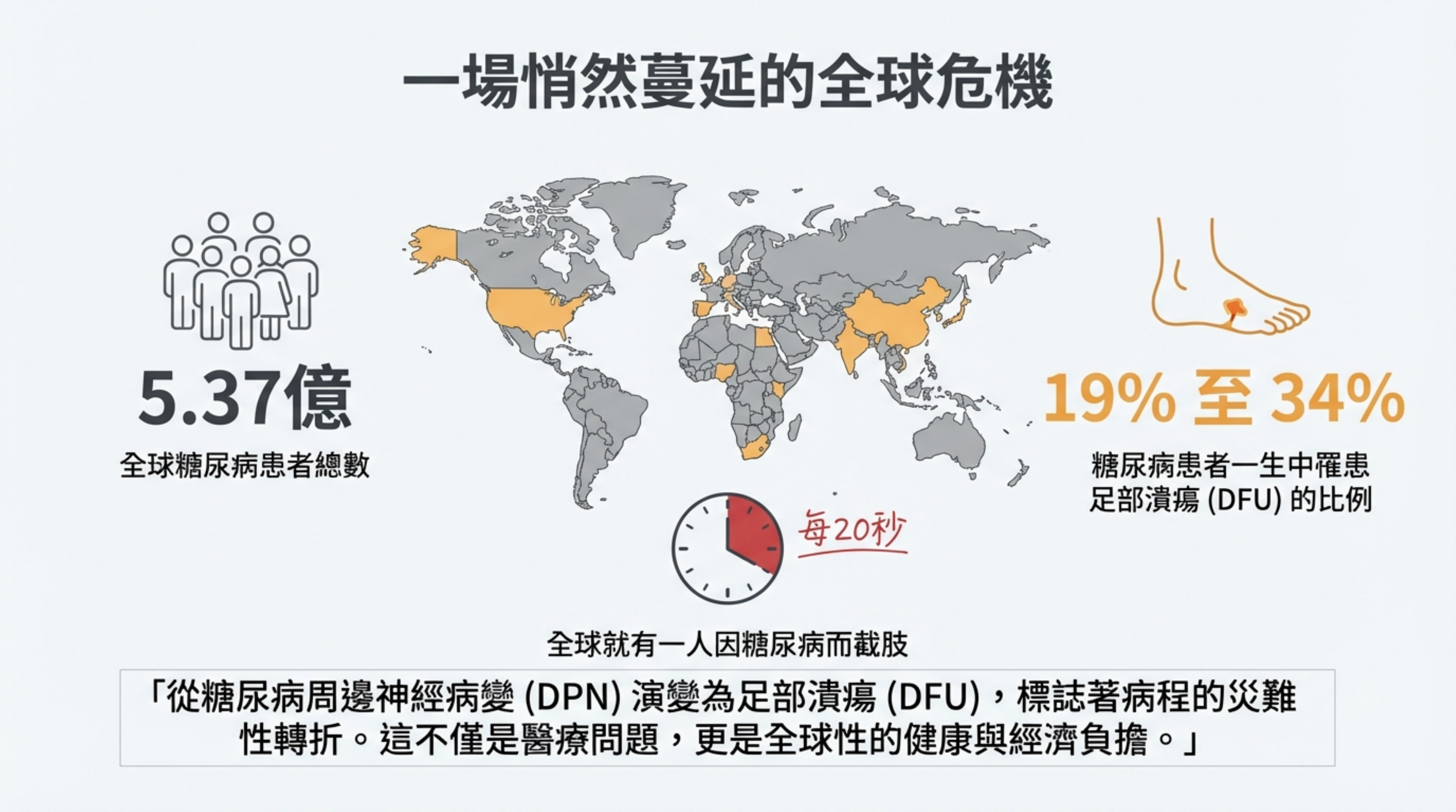 詳細說明: 用數據量化了問題的嚴重性,強調 DPN 和 DFU 是全球性的流行病。
