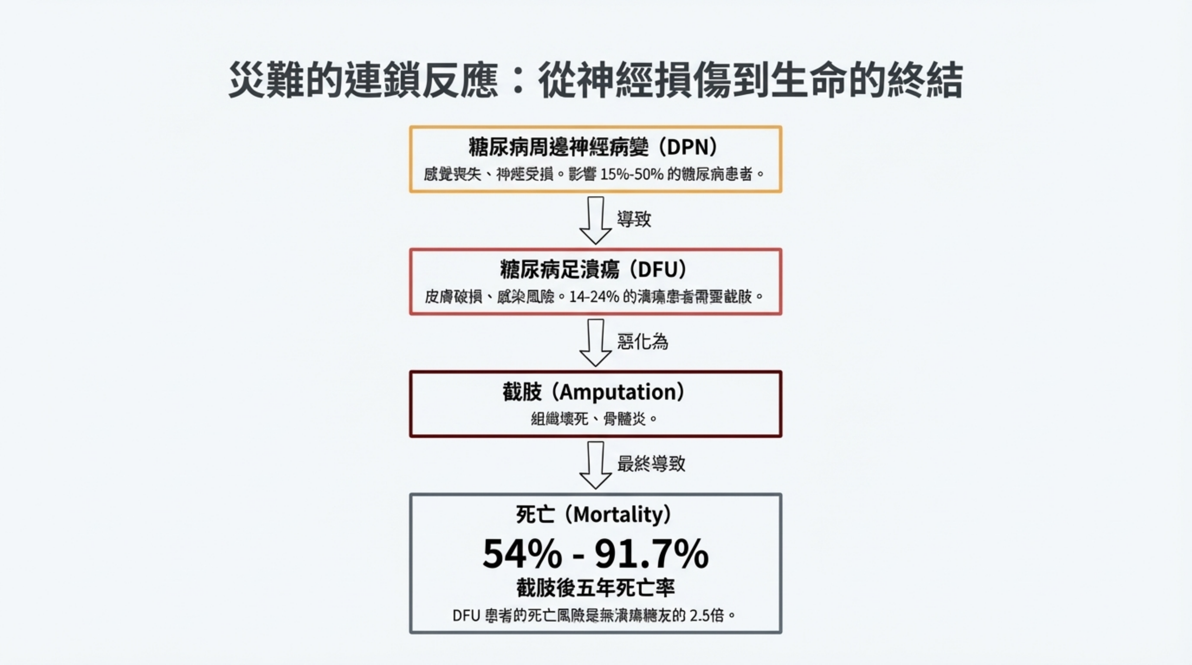 - 死亡 (Mortality): 最令人震驚的數據在於截肢後的 5 年死亡率高達 54% - 91.7%。這比許多癌症的致死率還高。DFU 患者的死亡風險是無潰瘍糖友的 2.5 倍。