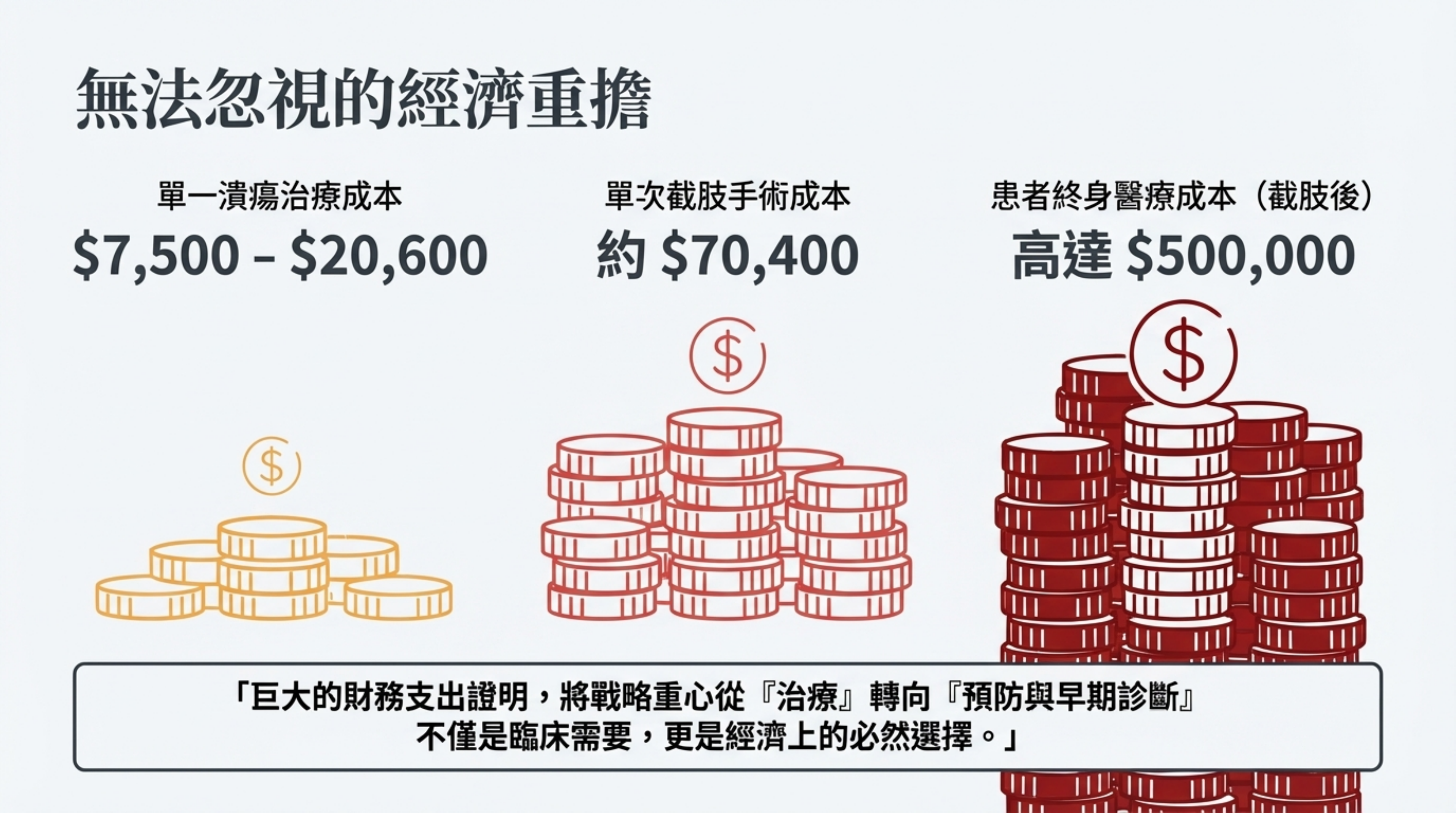 - 截肢代價: 若進展到截肢,單次手術成本激增至約 $70,400 美元。