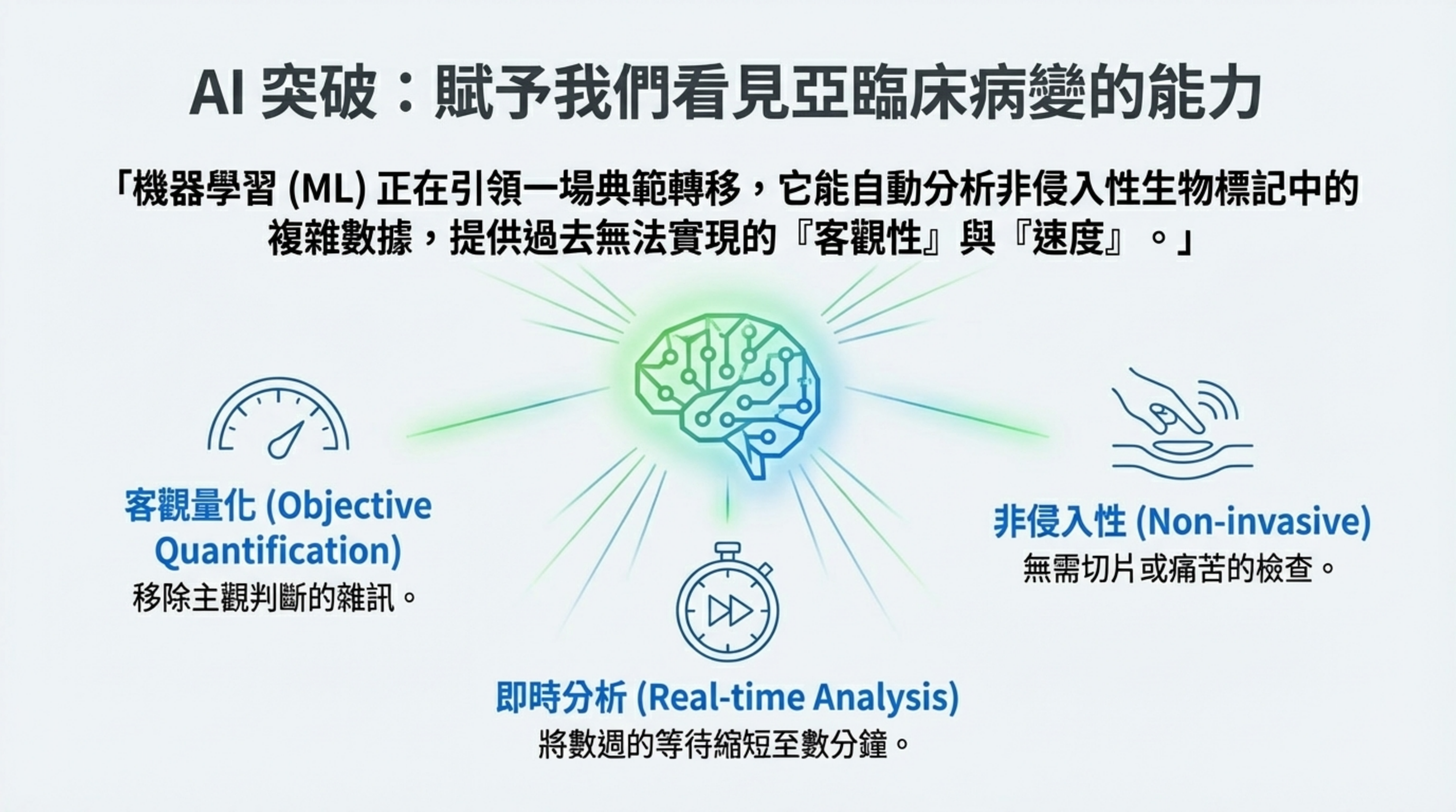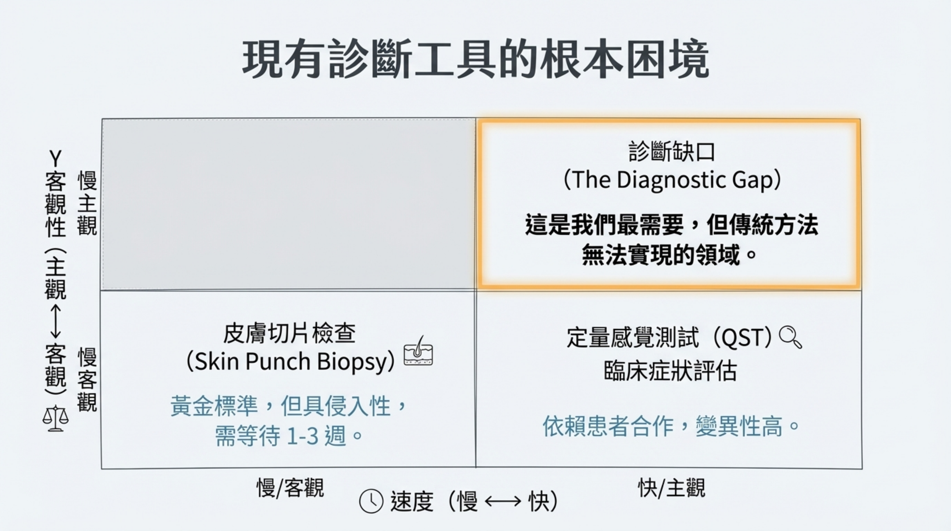 診斷缺口 (The Diagnostic Gap): 右上角「快/客觀」的區域是空白的。臨床迫切需要一種既像切片一樣客觀,又像問診一樣快速的工具,這正是 AI 的切入點。