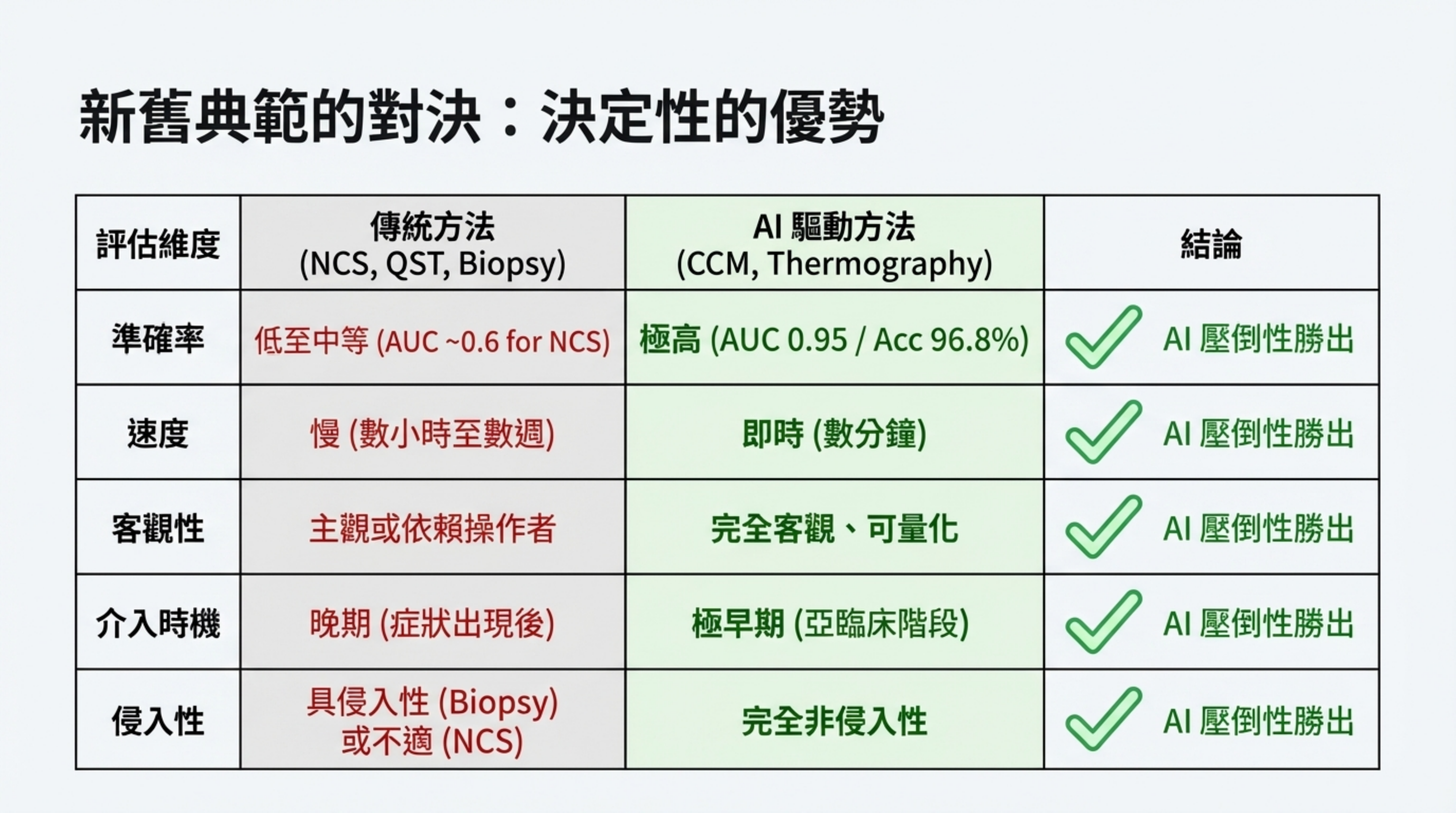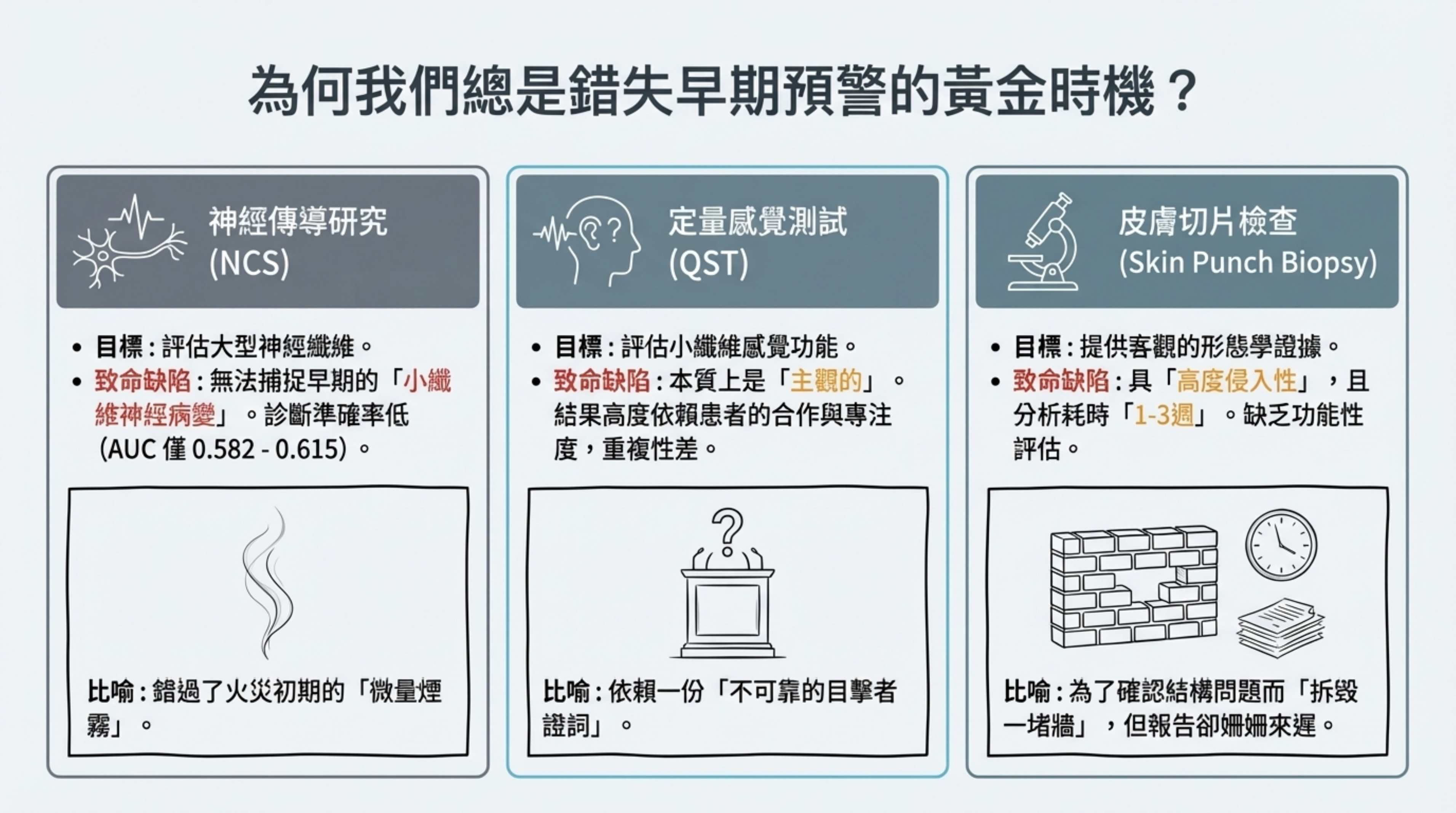 - 神經傳導 (NCS): 僅測量大型神經纖維。但糖尿病神經病變最早發生於「小纖維」。NCS 對早期病變的 AUC 僅 0.582-0.615,形同猜測。