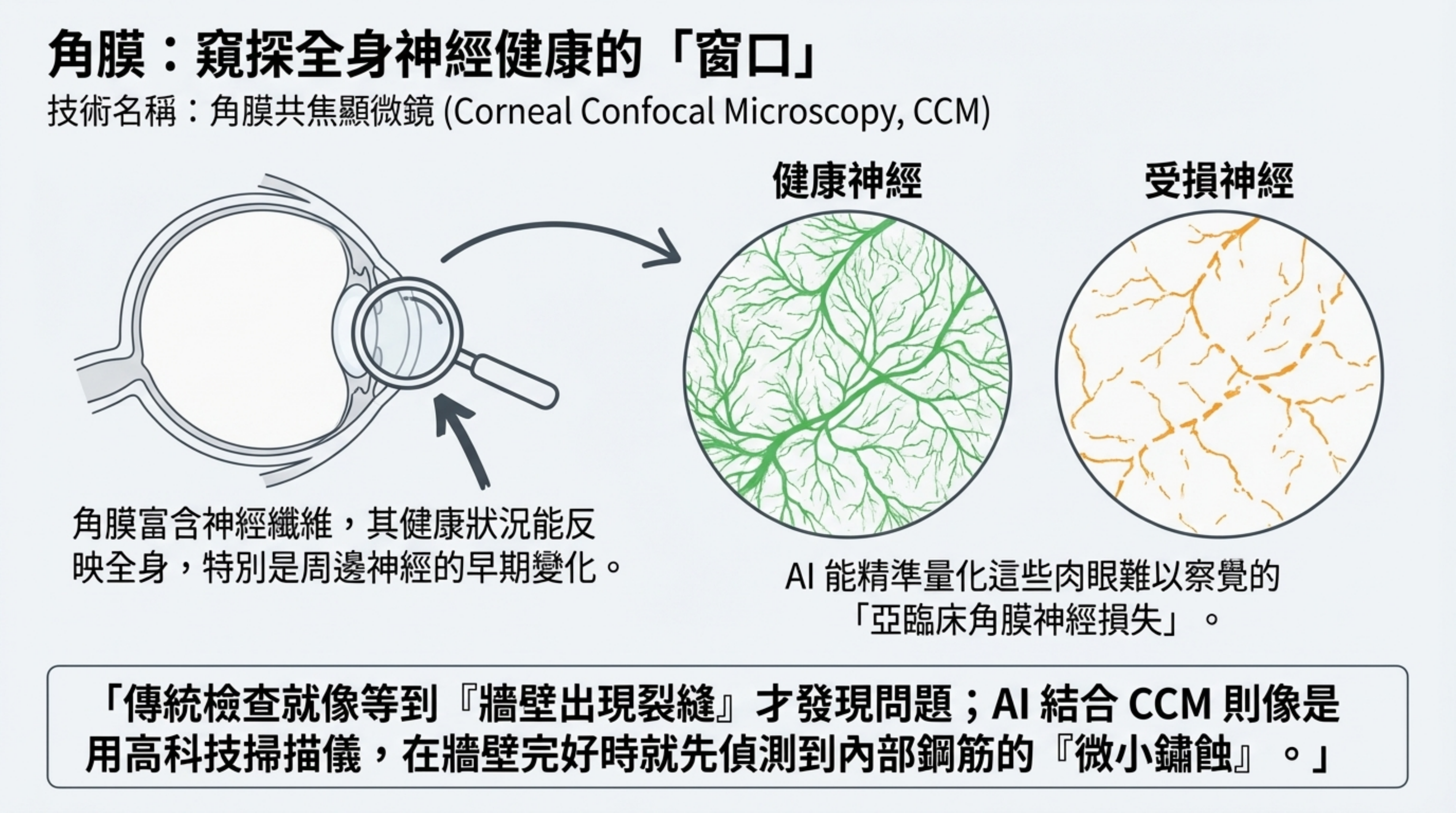 原理: 角膜擁有極高密度的神經纖維 (C纖維)。因為角膜透明,這是人體唯一可以「非侵入性」直接看到活體神經結構的地方。