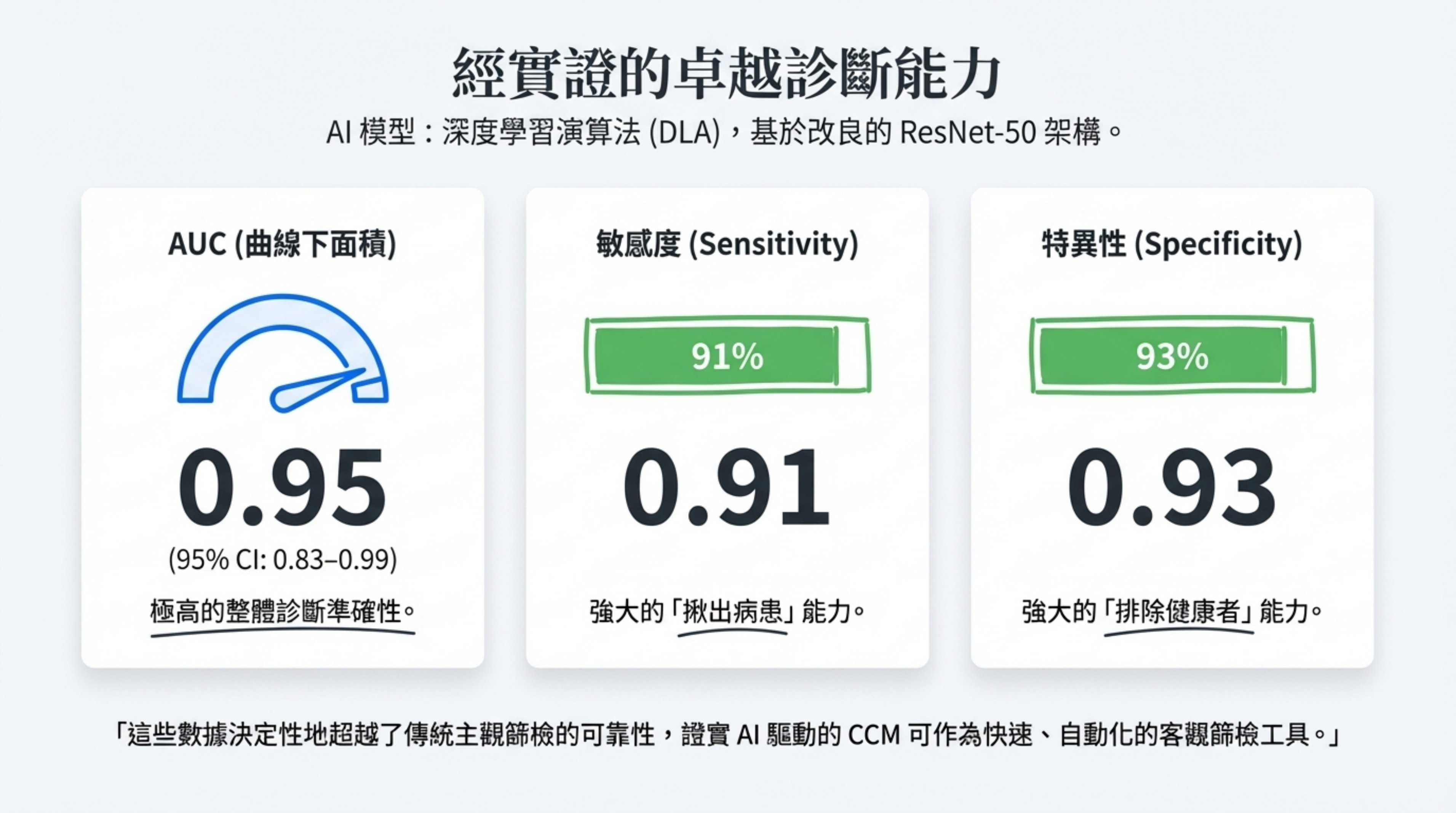 敏感度 91%: 能有效找出 91% 的病患(低偽陰性),這對於篩檢工具至關重要。