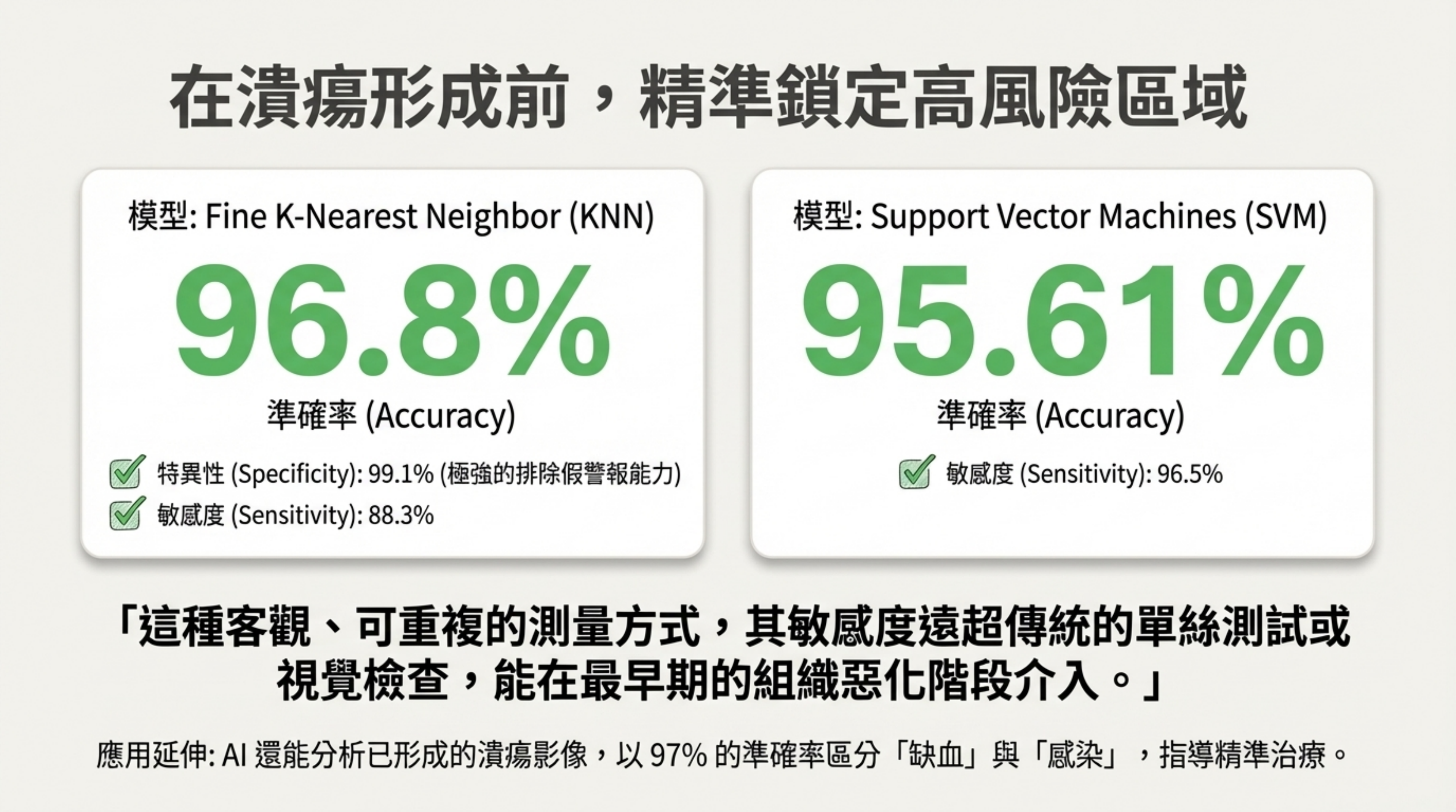 應用延伸: 除了預防,AI 還能以 97% 的準確率區分已形成潰瘍中的「缺血」與「感染」,指導醫生進行清創或血管重建。