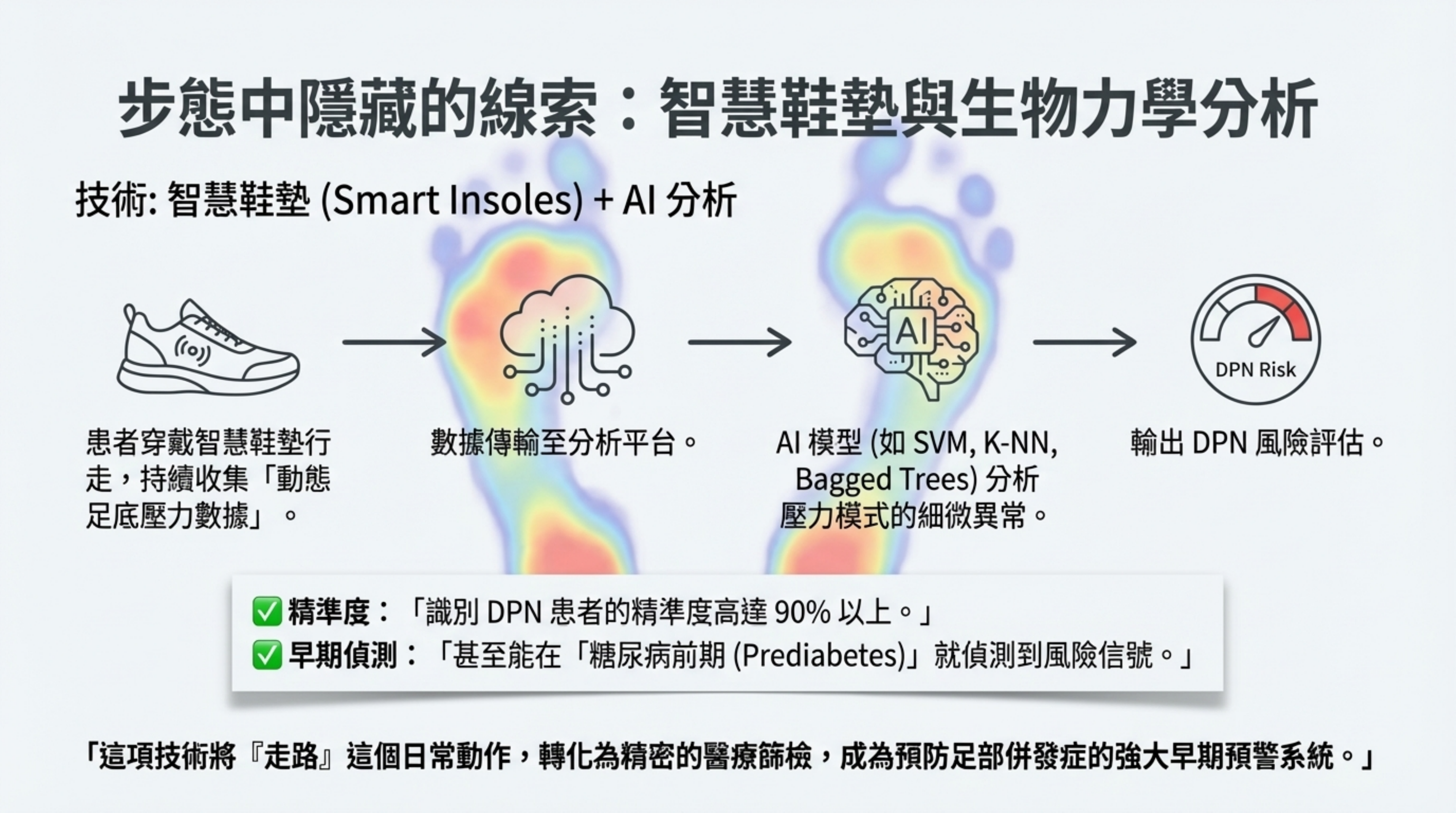 AI 分析: 收集走路時的動態足底壓力數據。AI 模型 (如 SVM, K-NN) 能從步態模式的細微異常中識別出 DPN 風險。