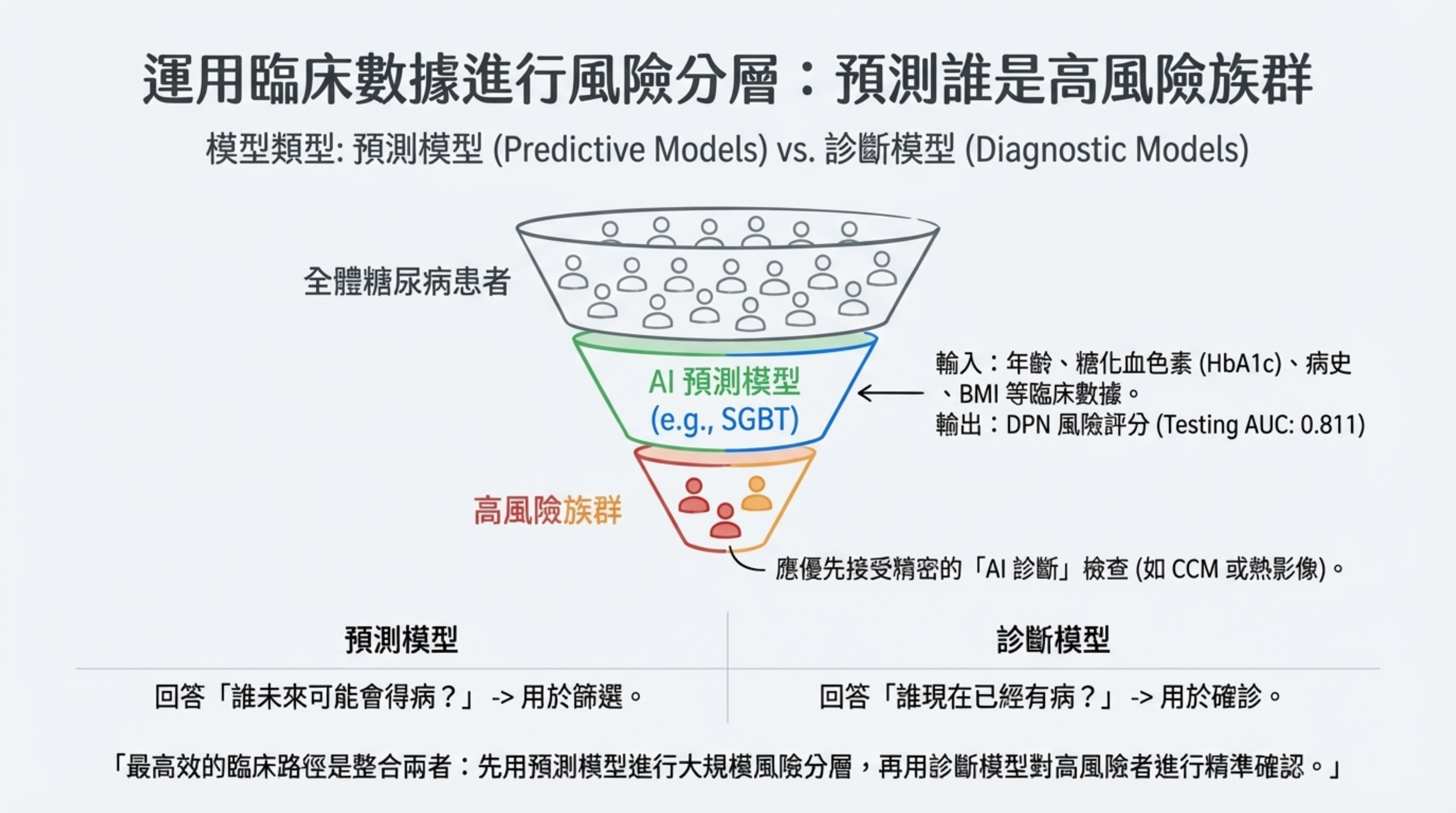 預測模型 (Predictive): 使用年齡、HbA1c、BMI 等臨床數據。例如 **SGBT 模型 ** (AUC 0.811) 可用於大規模、低成本的初篩,回答「誰未來可能會得病?」。