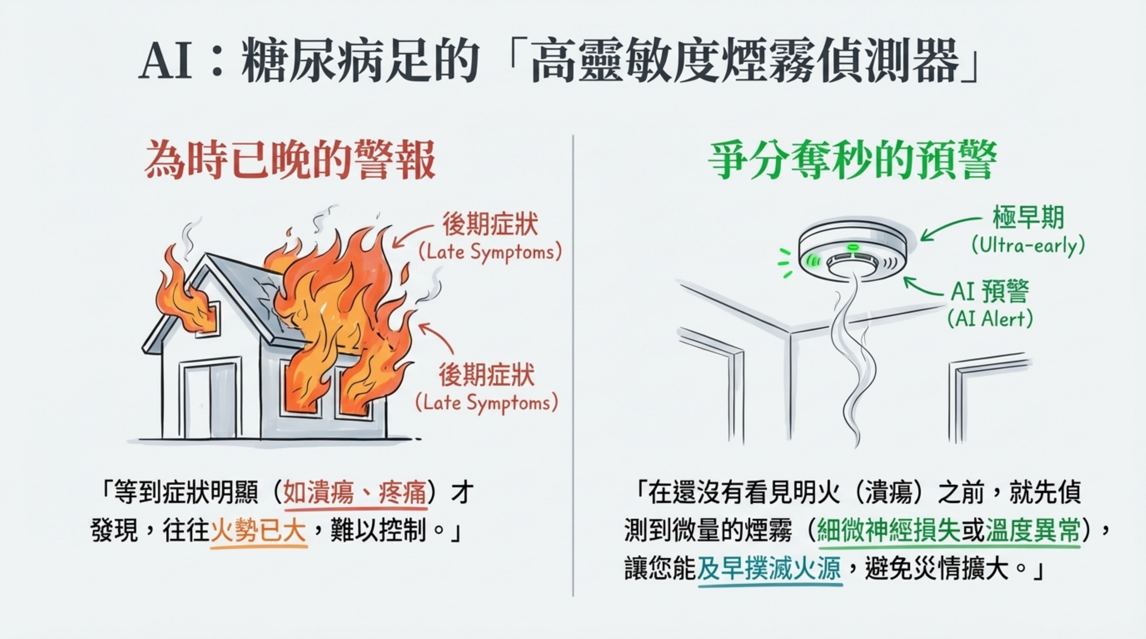 AI = 爭分奪秒的預警: 在還沒看見火苗前,偵測到微量的煙霧(細微神經損失或溫度異常),讓醫生能及早撲滅火源,避免災情擴大。