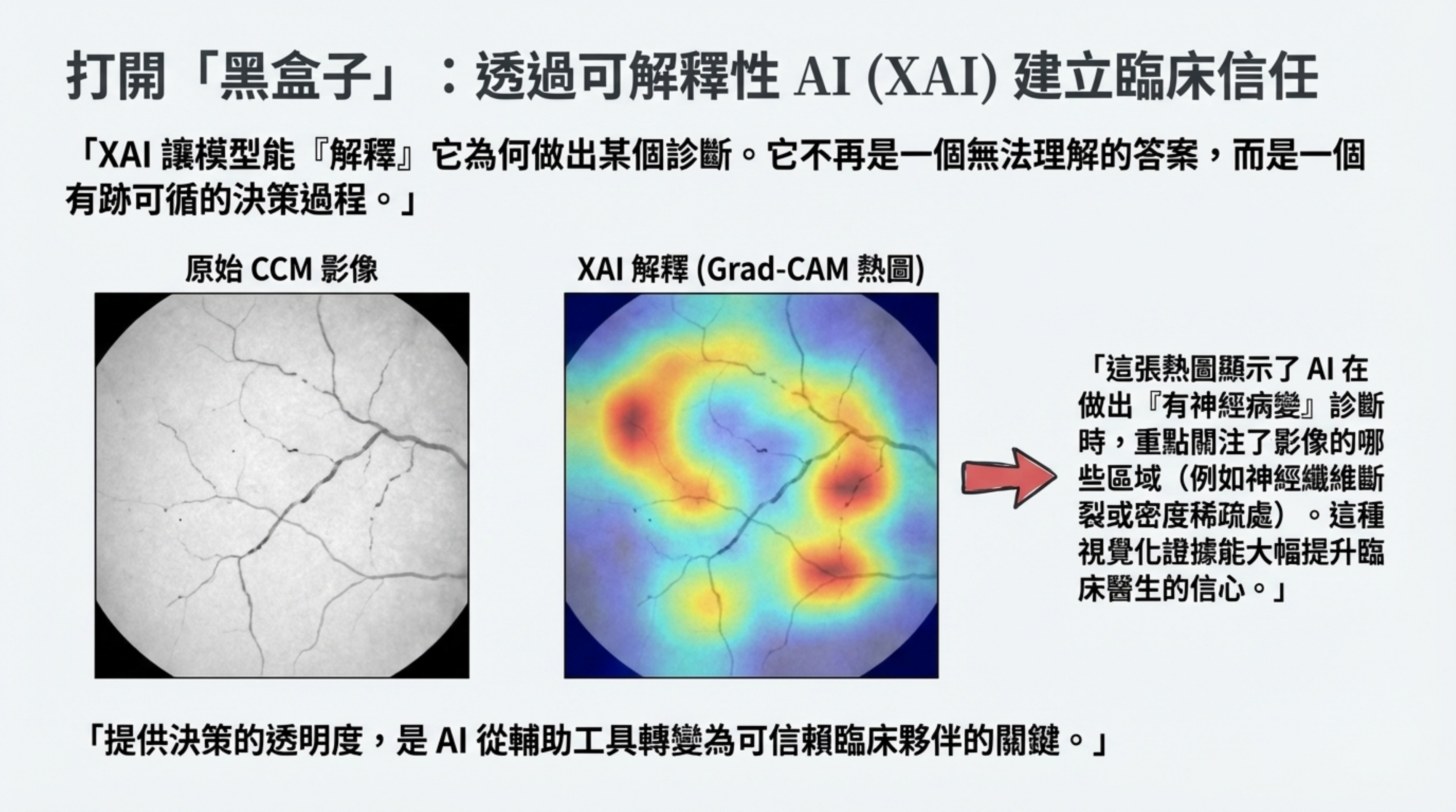 Grad-CAM 熱圖: 這是 CCM 研究中使用的技術。它能將 AI「看到」的重點區域(如神經斷裂處)用熱圖標示出來。