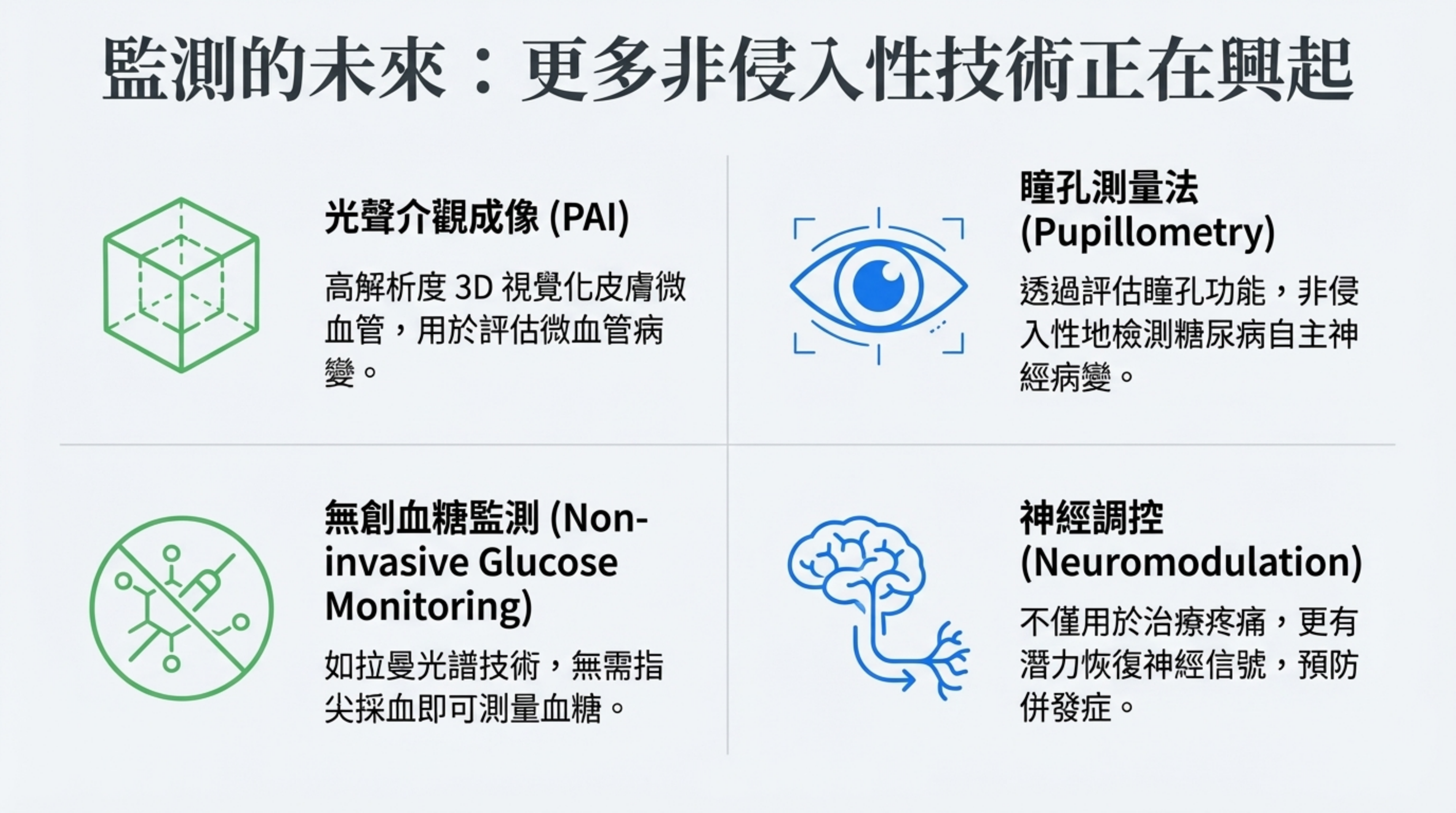 無創血糖監測: 如拉曼光譜技術。