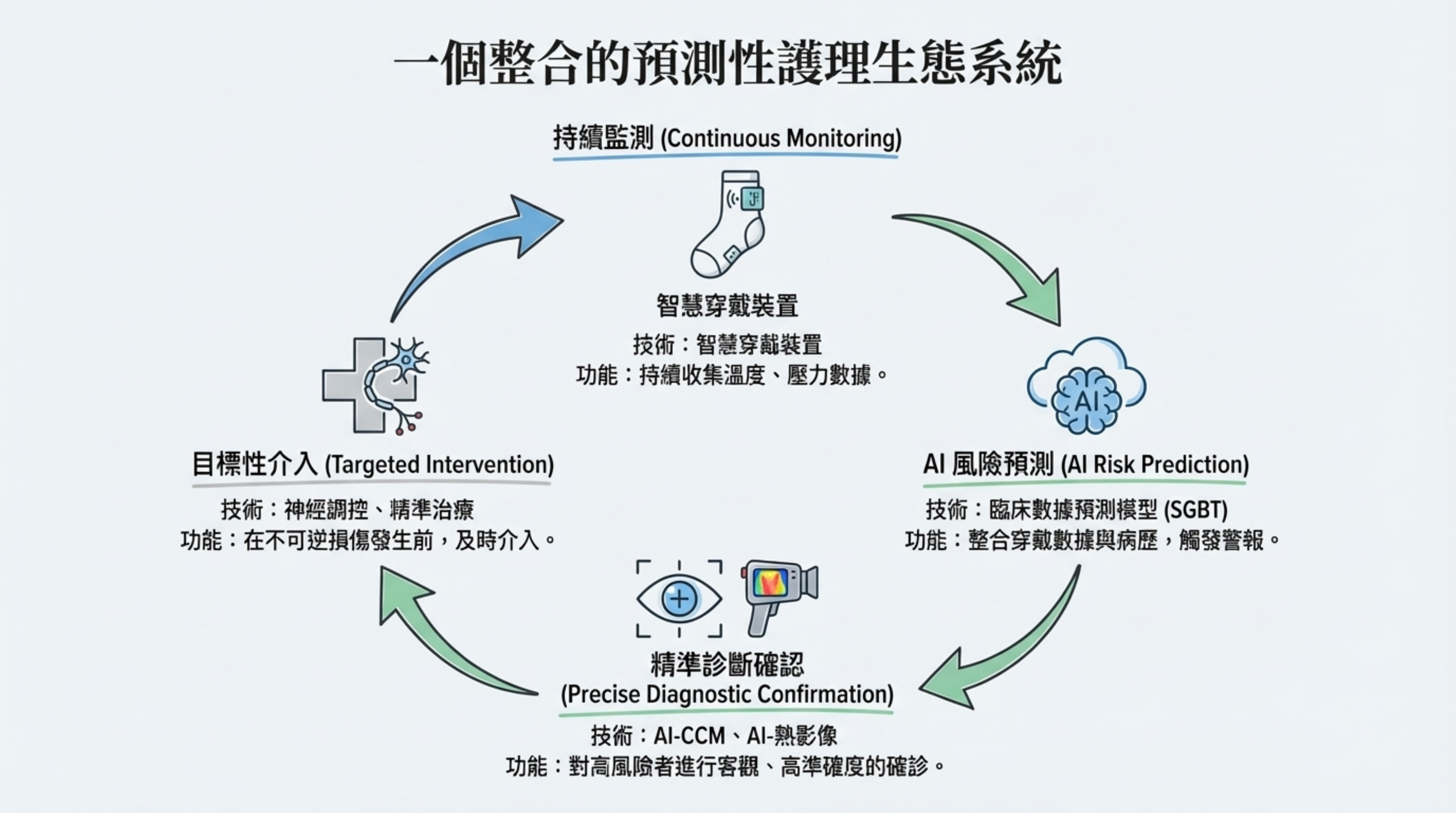 未來主動模式 (Proactive Prevention): 透過 AI 分析多維數據(影像、生理指標),我們能在微觀病變階段(如微血管血流異常、小纖維神經受損)就識別風險,實現真正的「預防醫學」。