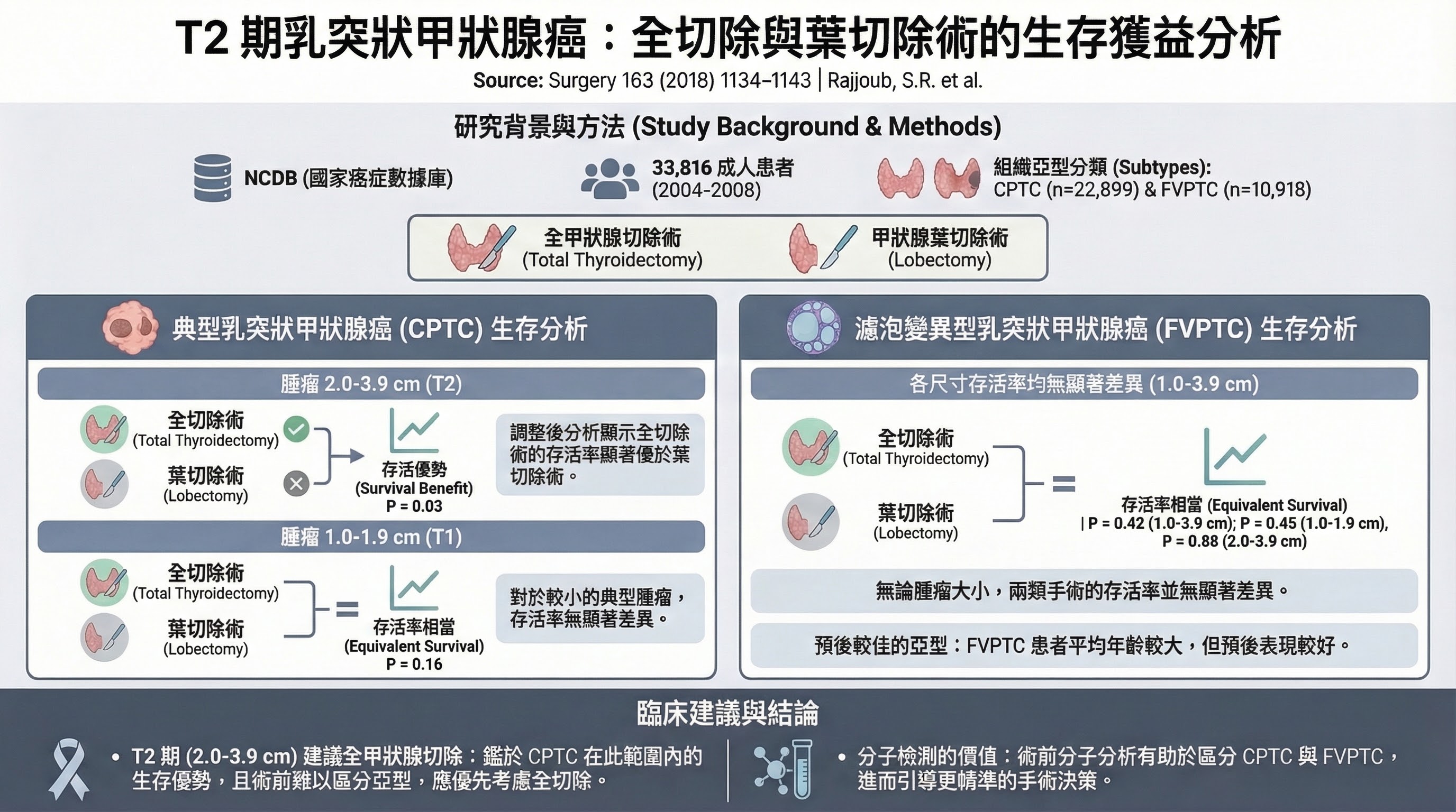- 研究設計: 回溯性 NCDB cohort,N=33,816(1–3.9 cm PTC,cN0,2004–2008)