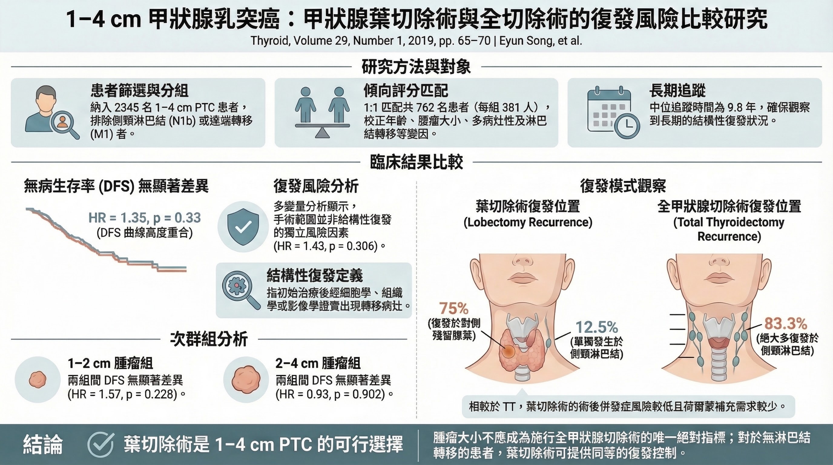 - PICO: P=1–3.9 cm PTC cN0, I=total thyroidectomy, C=lobectomy, O=overall survival(中位追蹤 6.49 年)