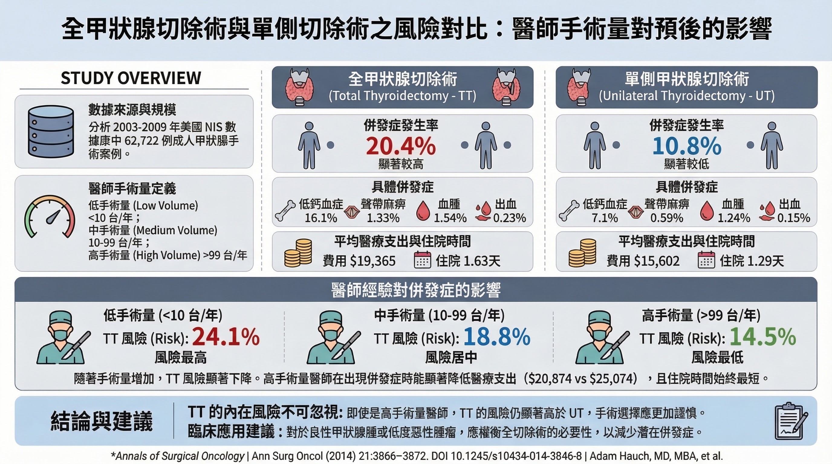 - 主要發現: 整體併發症率:TT 20.4% vs UT 10.8%;調整後 OR=2.154(CI 1.987–2.334)。高量外科醫師(>99 cases/yr):TT 14.5% vs UT 7.6%,調整後 OR=1.824(CI 1.458–2.281)——說明高手術量無法消除 TT 相對於 UT 的結構性風險差異