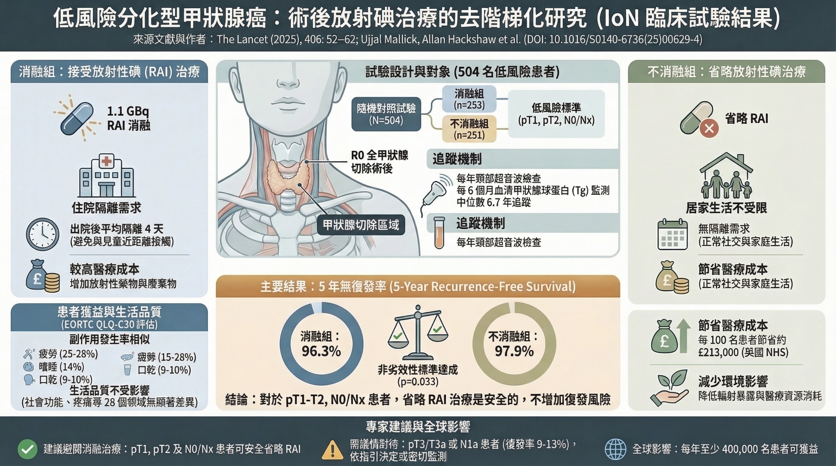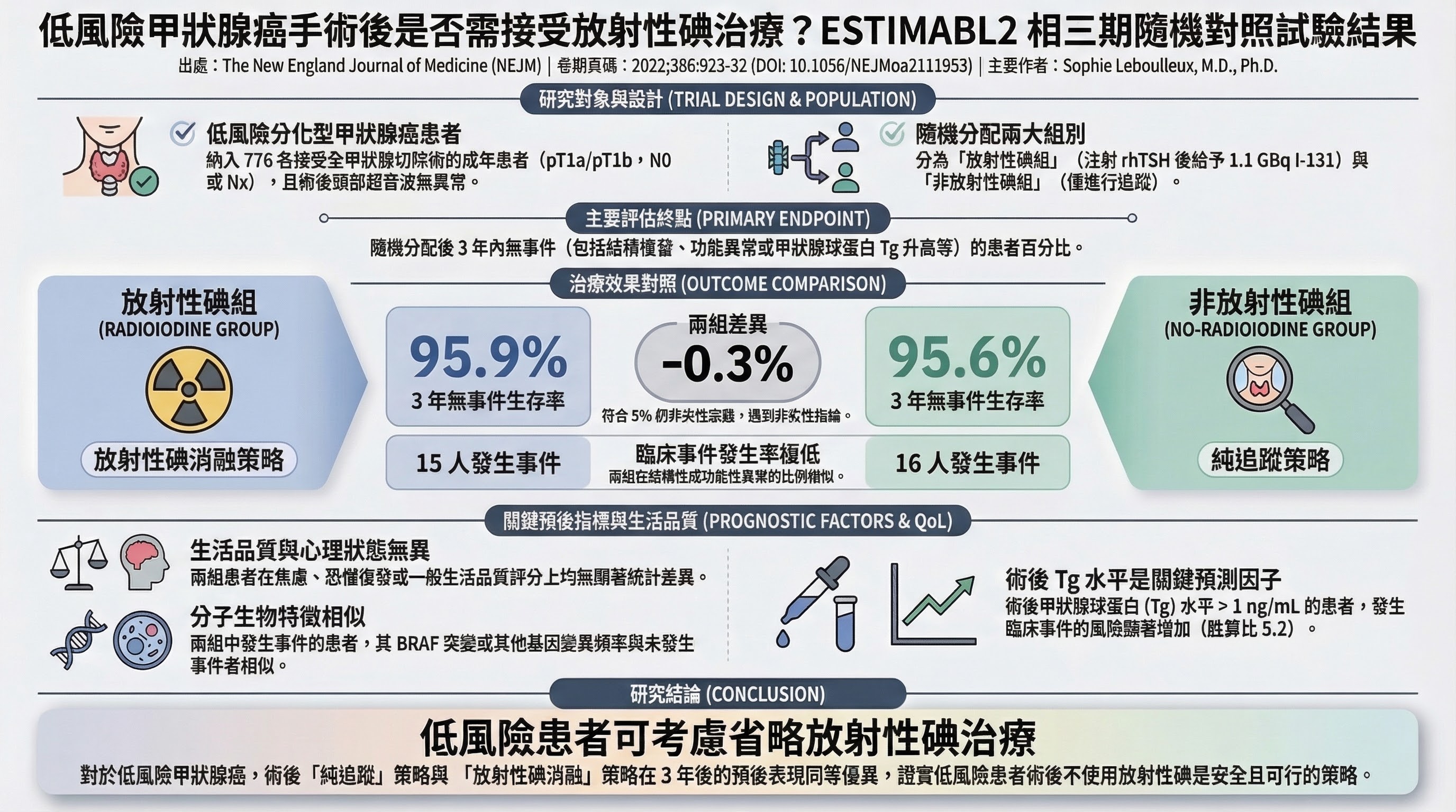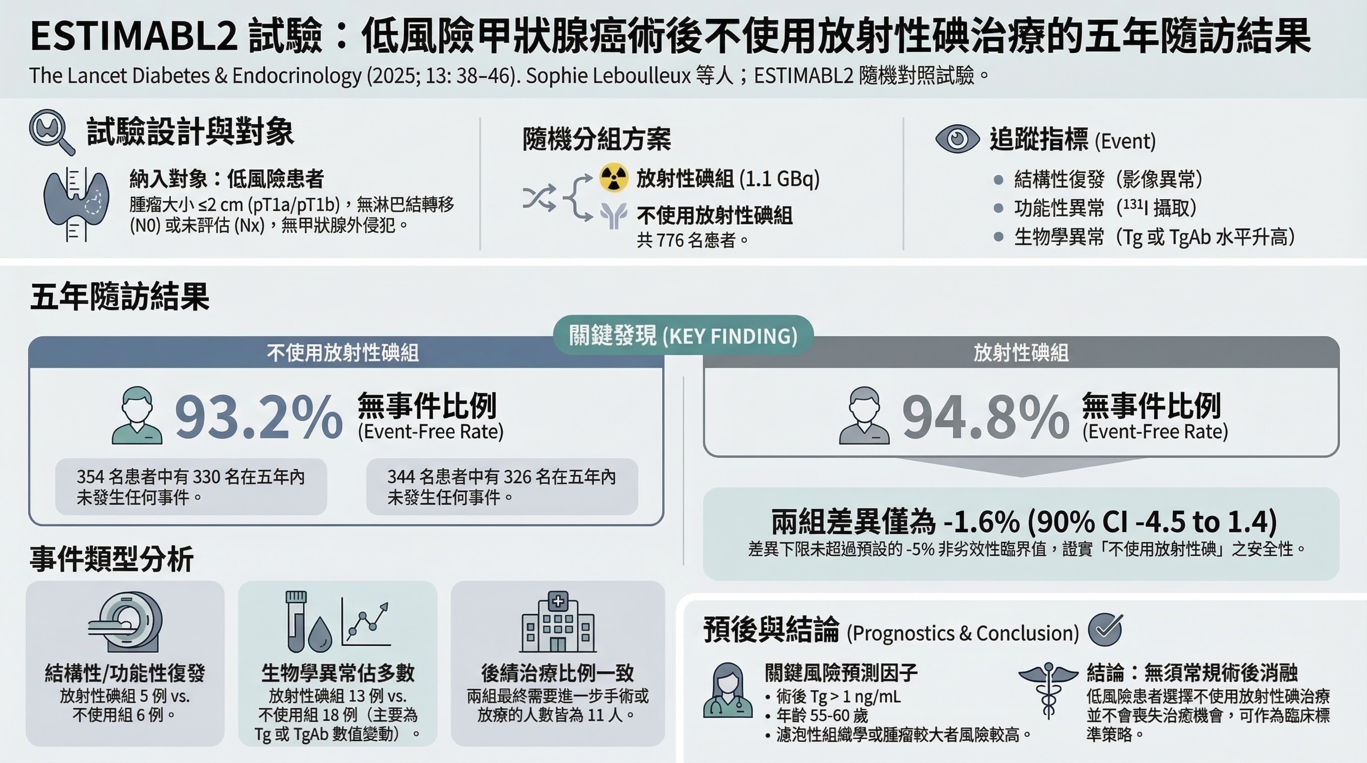 - 為什麼支持此 recommendation 變更: 首個 Phase 3 RCT 直接證明低風險 DTC 省略 RAI 的安全性,填補 2015 guideline 指出的關鍵空白