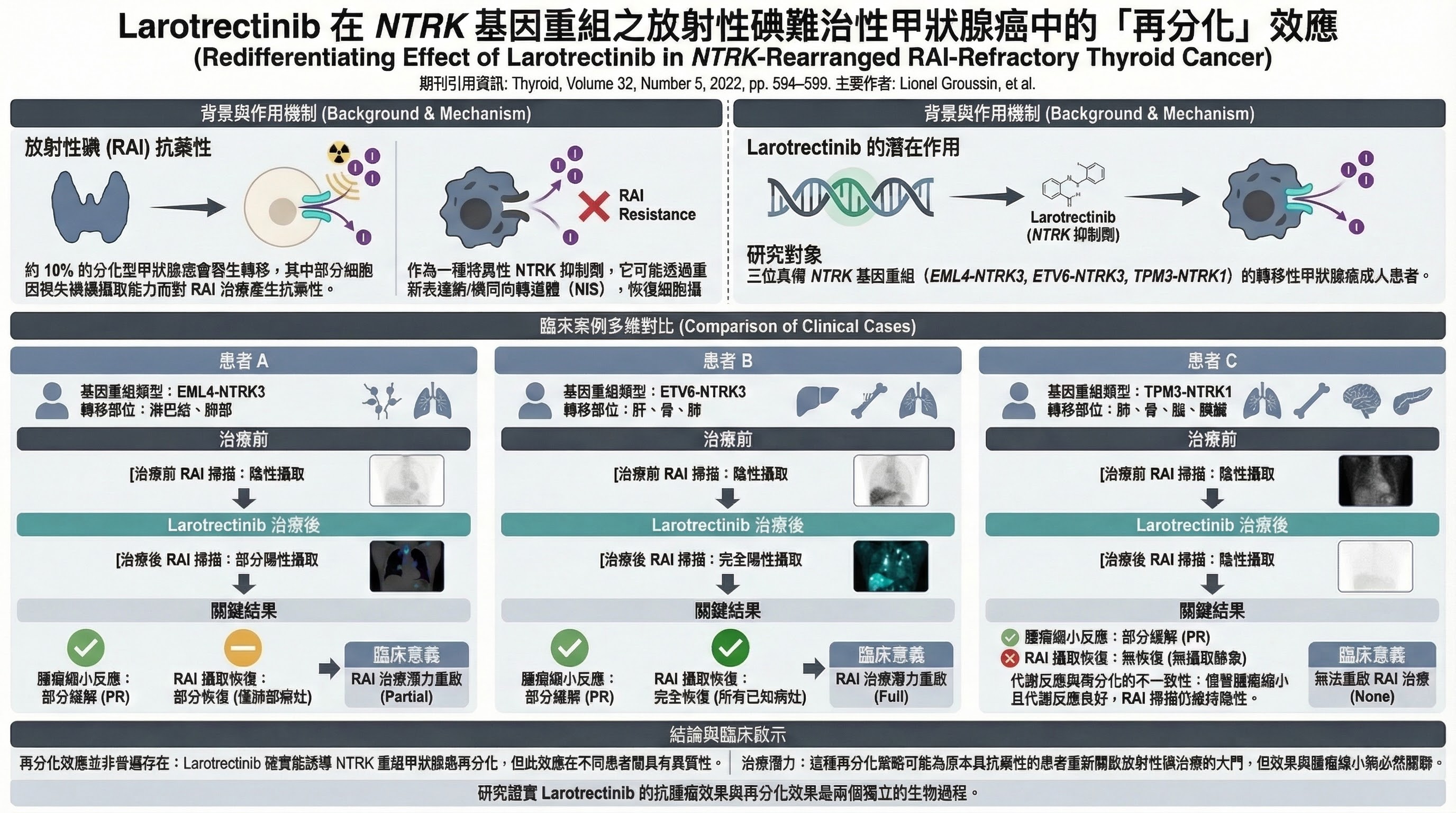 - 主要發現: Larotrectinib 在 NTRK fusion RAIR DTC 中誘導 redifferentiation(2/3 病例重新獲得 RAI avidity)