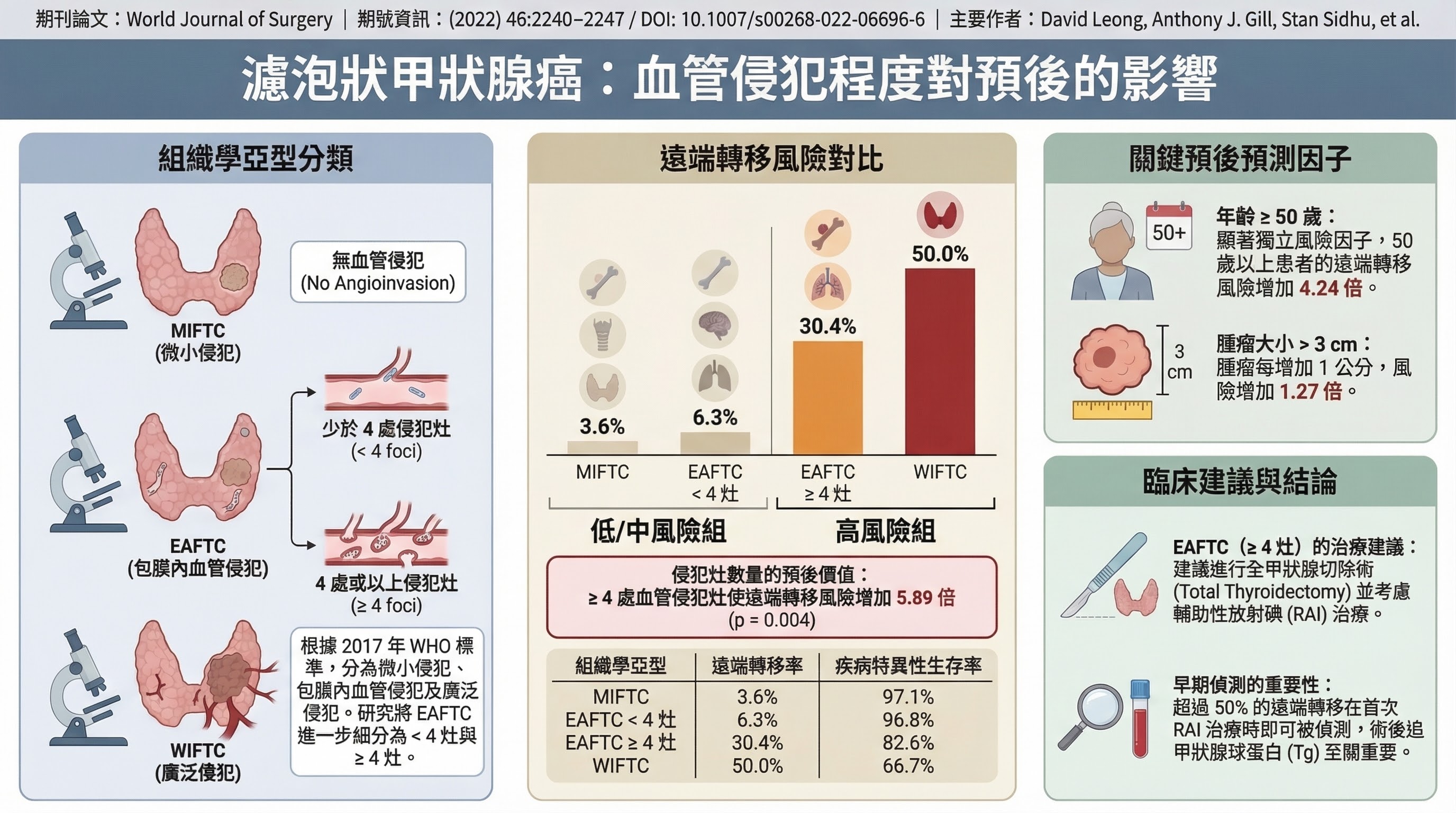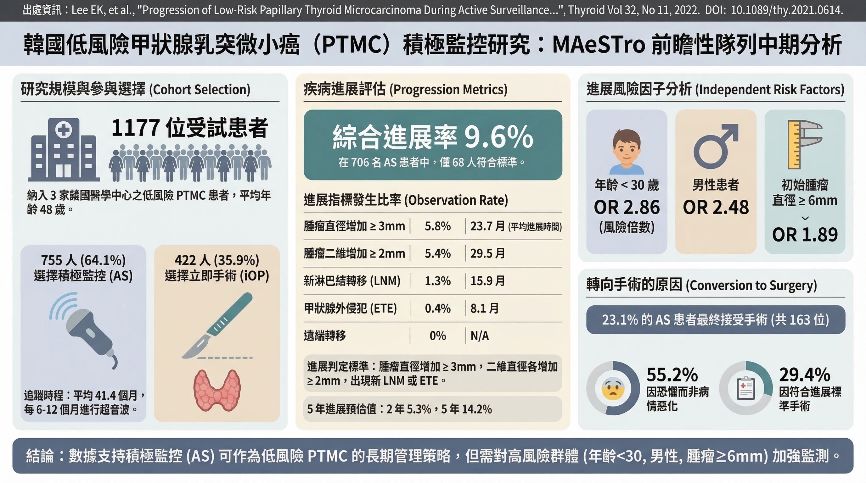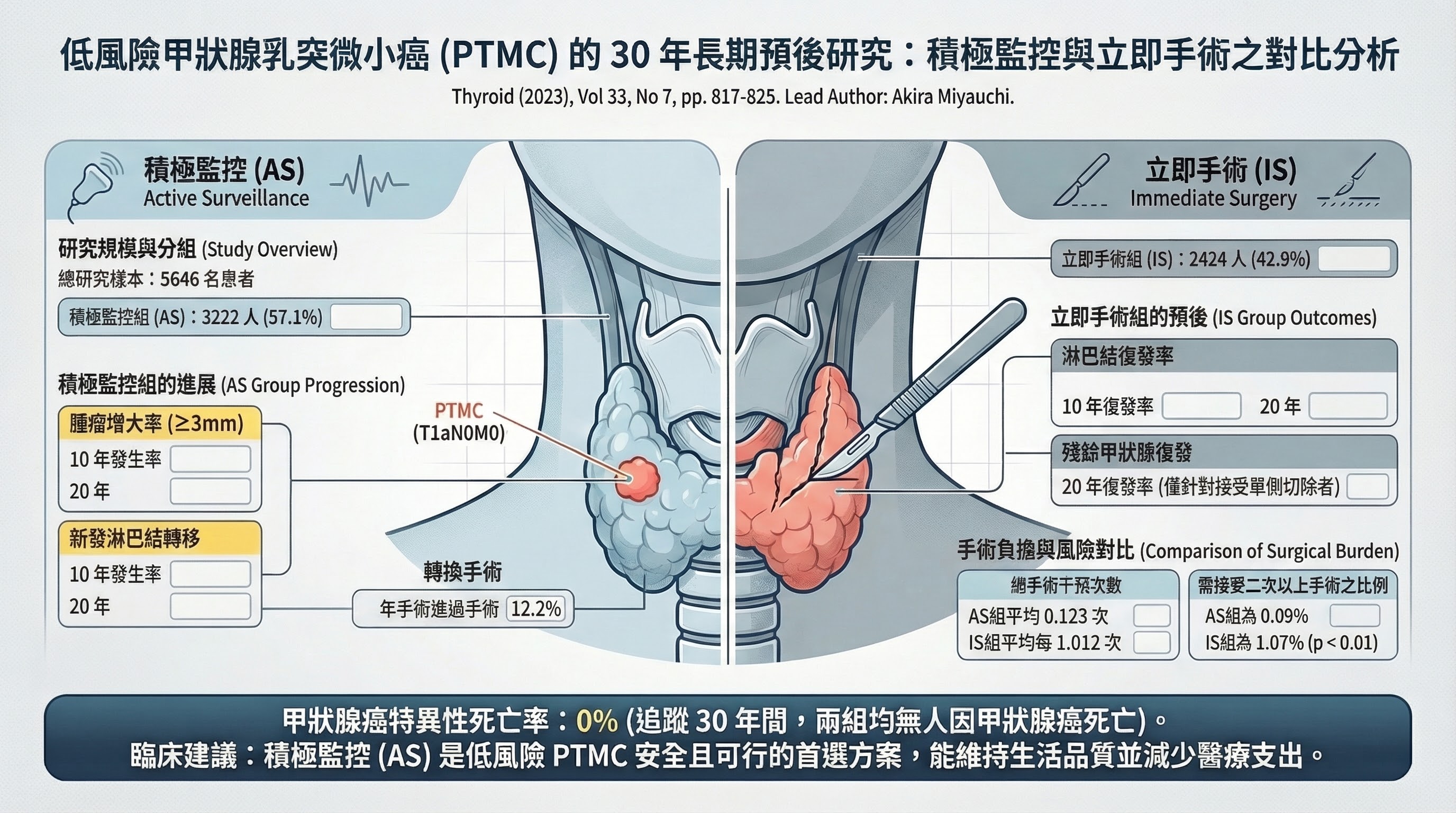 - 主要發現: 10 年腫瘤增大率僅 4.7%,20 年增大率 6.6%。10 年淋巴結轉移率 1.0%,20 年 1.6%。30 年追蹤期間無一人死於甲狀腺癌。由 AS 轉為手術者的預後與立即手術者完全相同。