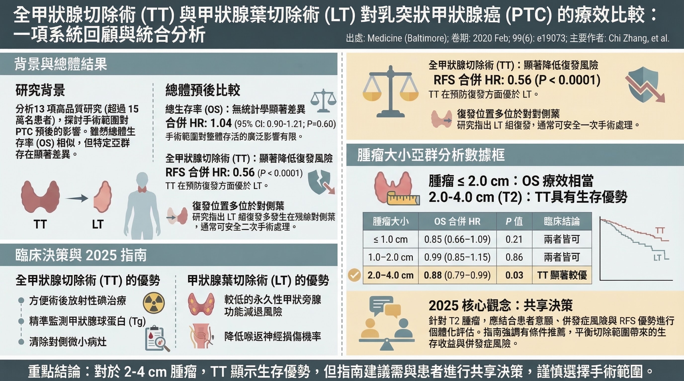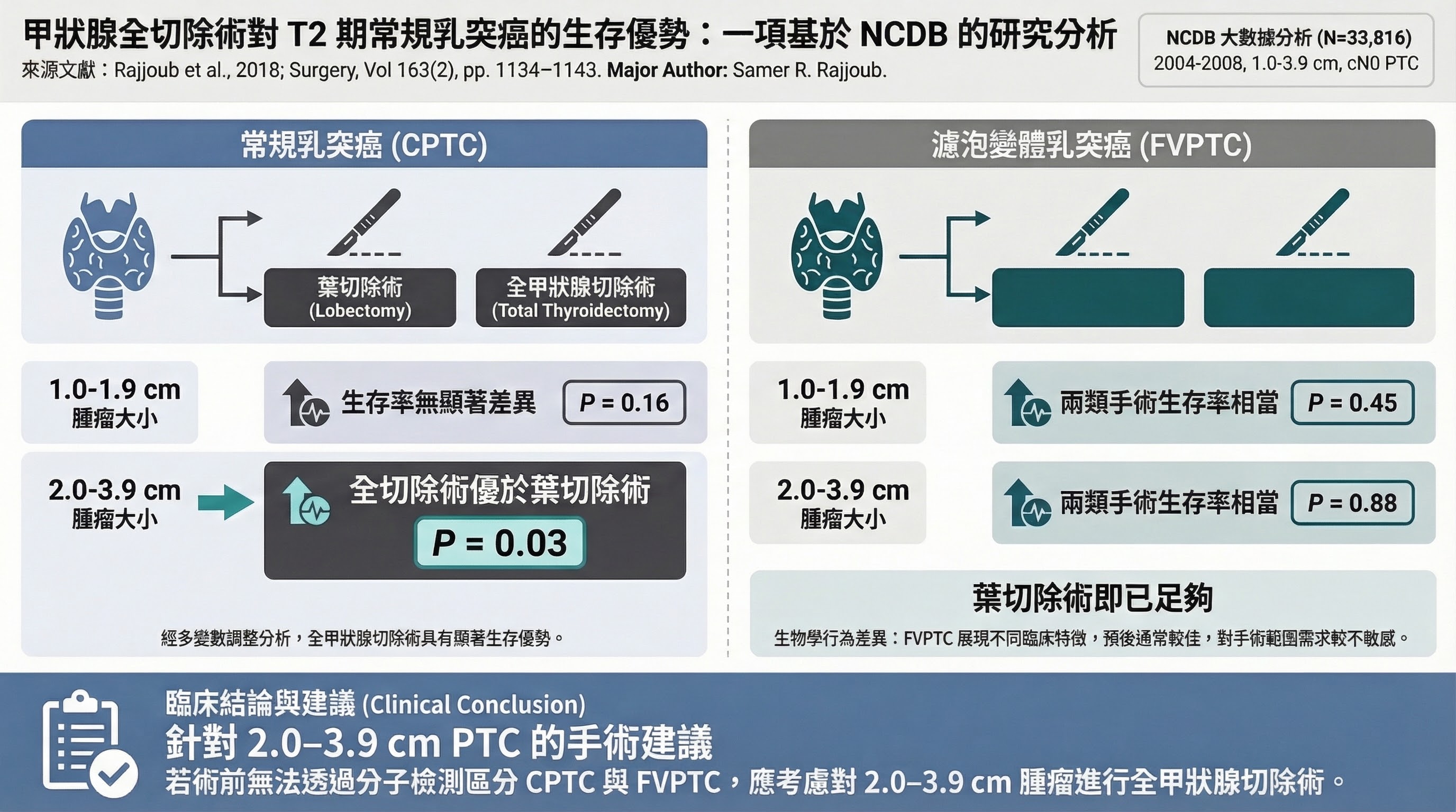 Rajjoub 2018 對 conventional PTC 2.0–3.9 cm 發現 TT 有邊際存活優勢(HR 1.53, P=0.022),但 Song 2019 的 propensity-matched 研究顯示 HR 0.93(P=0.902)——數據衝突,合理的結論為 SDM,而非強制性建議。FVPTC 在兩項研究中均無差異。