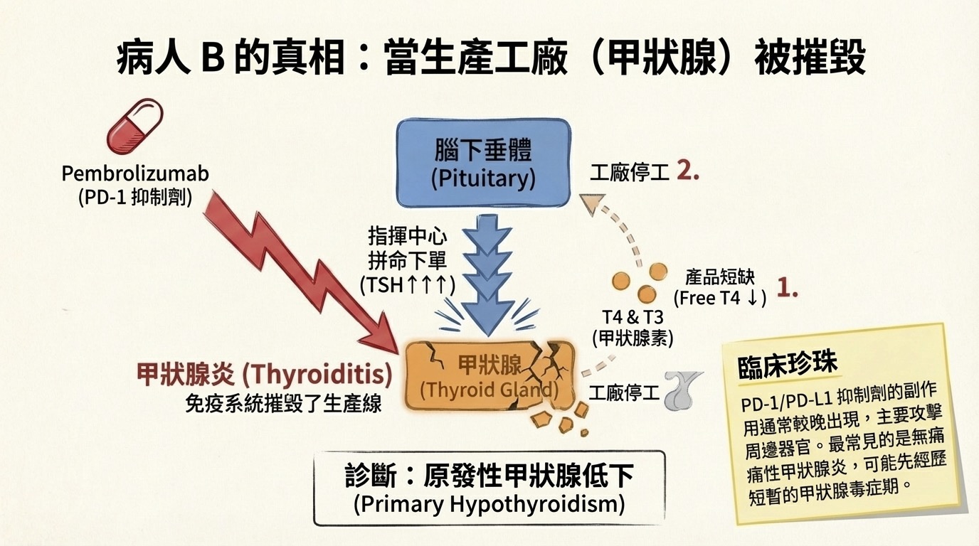 - 病人 B (Pembrolizumab): 驗出 TSH 85 mIU/L (高) 診斷為 Thyroiditis (原發性低下)。