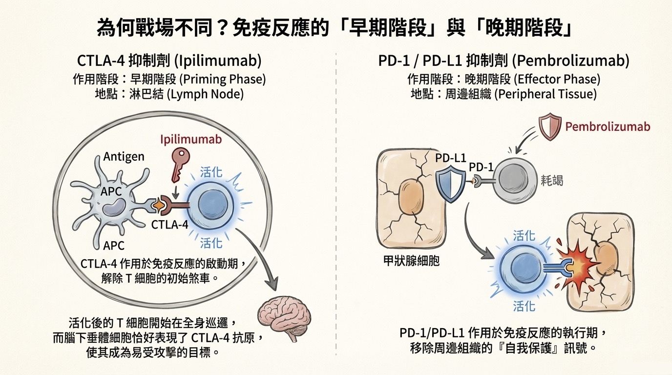 - 微觀機制 (Priming Phase): CTLA-4 作用於免疫反應的早期(淋巴結中)。腦下垂體細胞表面剛好異位表現 (Ectopic expression) CTLA-4 抗原。當藥物在淋巴結解除了 T 細胞的武裝限制,這些 T 細胞出巡時,第一眼就鎖定腦下垂體進行攻擊。
