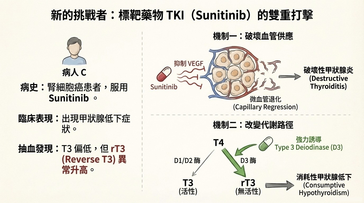 代表藥物: Sunitinib, Sorafenib(用於腎細胞癌、甲狀腺癌等)。 這類藥物對甲狀腺的打擊是雙重的:既破壞結構,又消耗庫存。