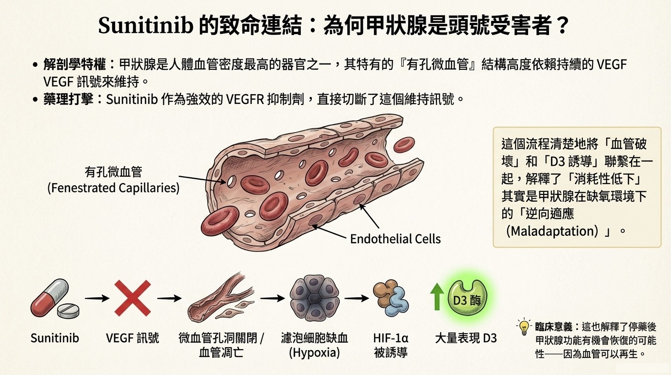 - 藥理打擊: Sunitinib 是強效的 VEGFR 抑制劑。阻斷訊號後,甲狀腺微血管的「孔洞」關閉,甚至導致微血管本身的凋亡與稀疏化 (Rarefaction)。