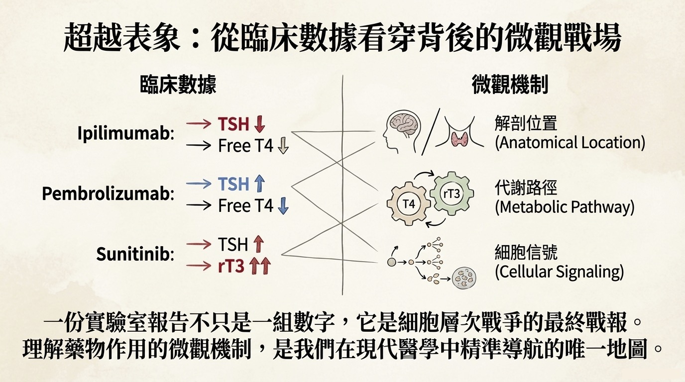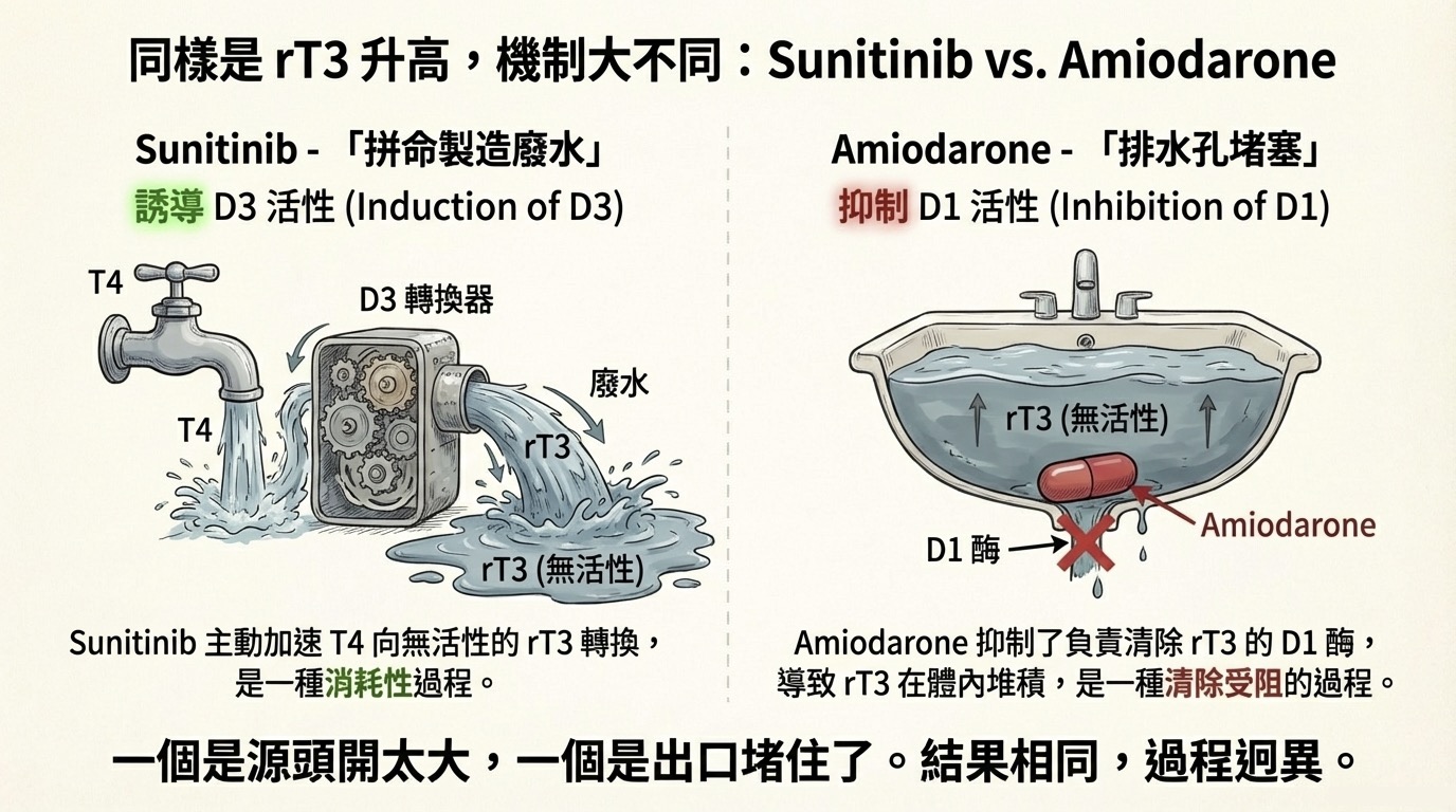 - 與 Amiodarone 的區別: Amiodarone 導致 rT3 高是因為「排水孔塞住(抑制 D1 清除)」;Sunitinib 是因為「瘋狂製造廢水(誘導 D3 生成)」。