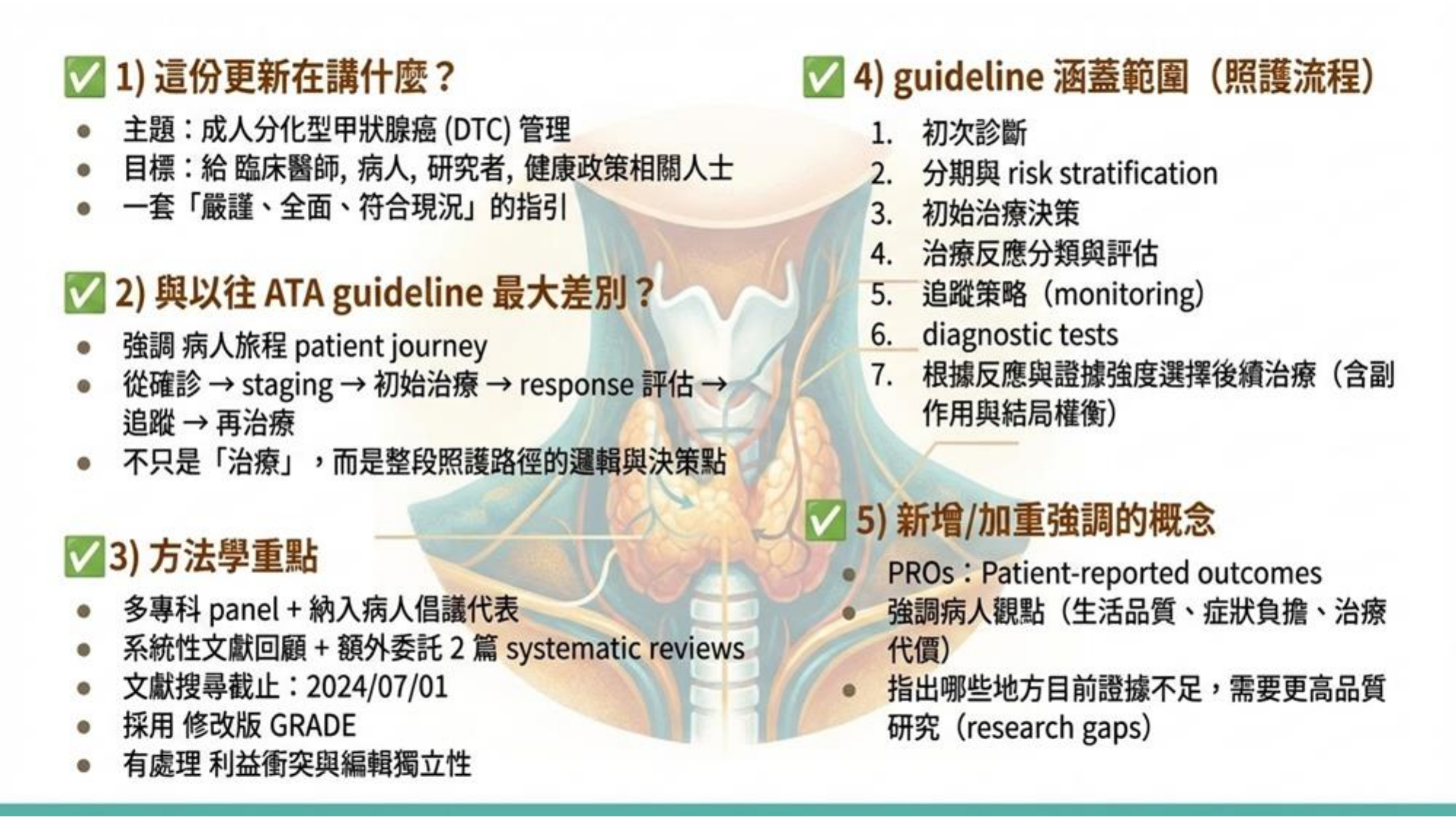 這次 2025 年的指引與以往最大的差異在於強調「病人導向」(Patient-Centered) 的選擇。不再只是單純針對某種病況建議做什麼處置,而是根據不同病人的生活品質負擔、副作用風險來進行討論。修訂過程納入了多篇大型系統性分析 (Systematic Reviews),涵蓋範圍從診斷、分期、治療後反應到後續追蹤。