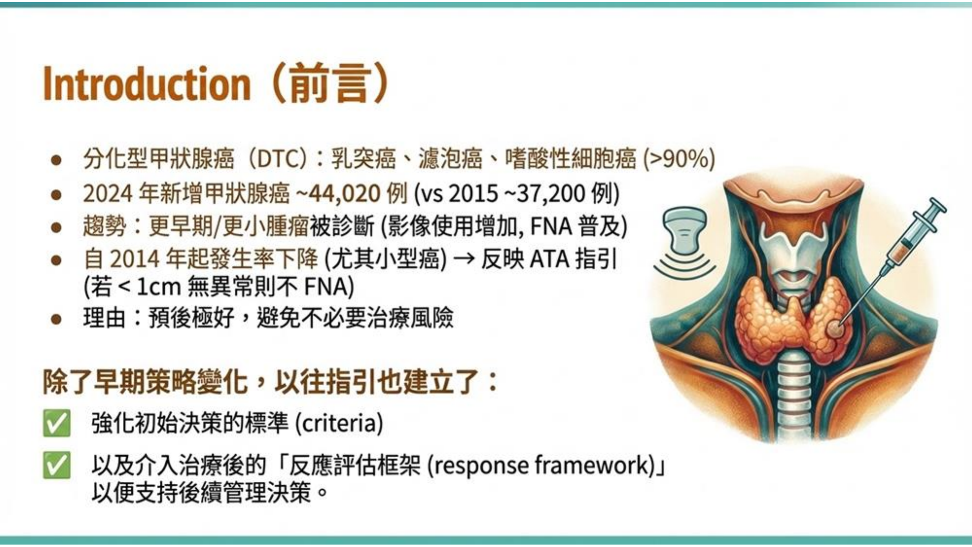 - 下降趨勢 (2014年後): 2014 年 ATA 指引新增建議「小於 1 公分且無異常特徵的腫瘤不建議做細針穿刺 (FNA)」,這導致小型癌症的發生率有所下降。這是為了避免對預後極好的微小腫瘤進行過度治療 (Over-treatment)。