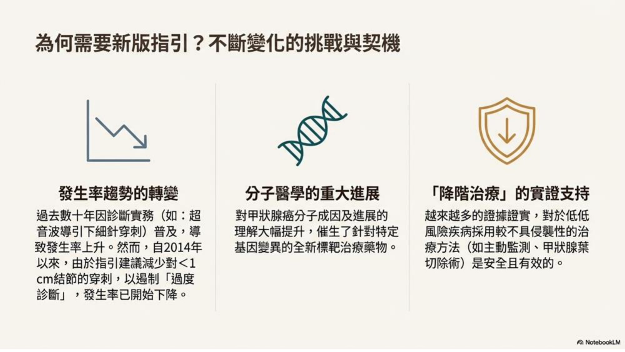 除了流行病學趨勢外,近年來分子醫學 (Molecular Medicine) 有重大突破,針對基因突變 (如 DNA Mutation) 的標靶藥物不斷更新。此外,「降階治療 (De-escalation)」的實證也得到支持——以往認為必須手術的病人,現在可能只需主動監測;以往需全切除者,現在可能只需部分切除。