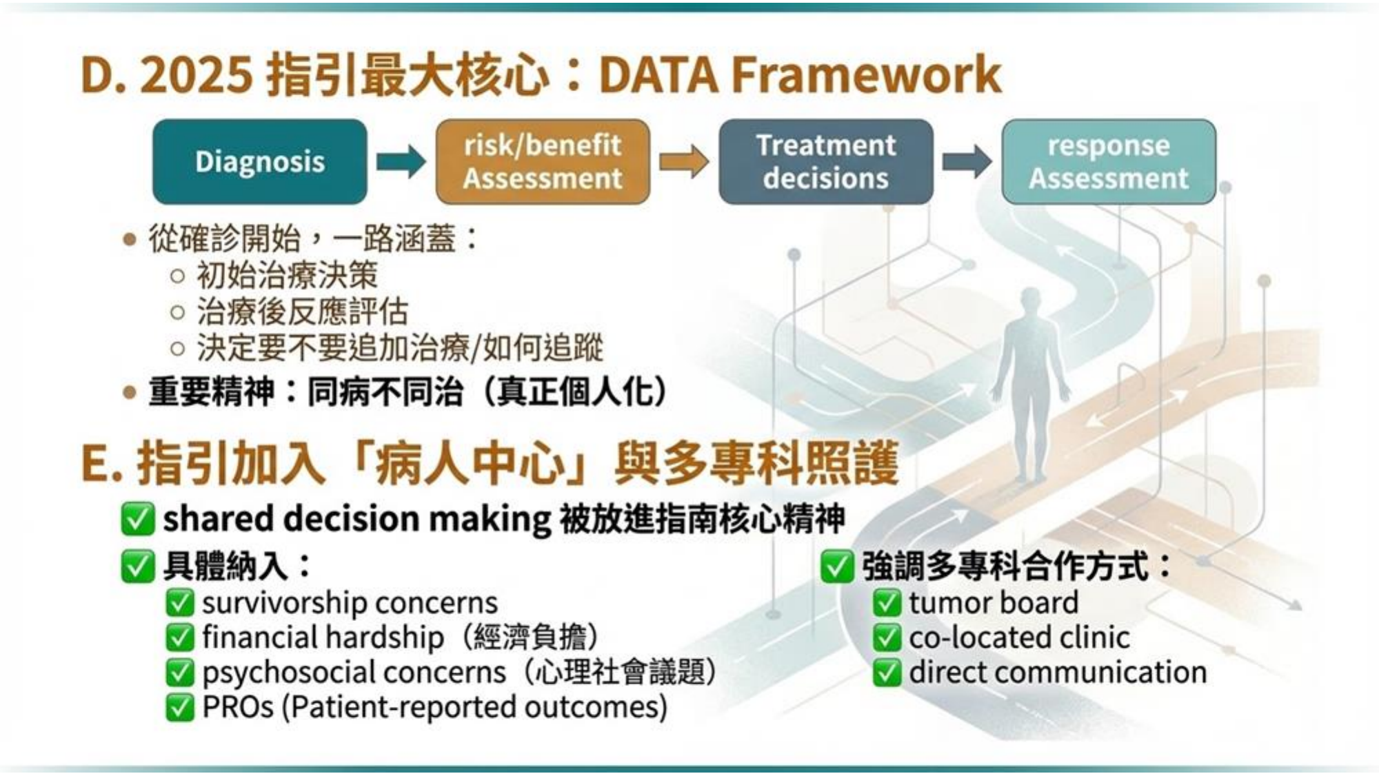 核心精神: 即使是同樣的疾病分期,在不同病人身上(考慮經濟負擔、心理社會狀態、個人態度),治療方式可能不同,真正實現個人化醫療與醫病共享決策 (Shared Decision Making)。