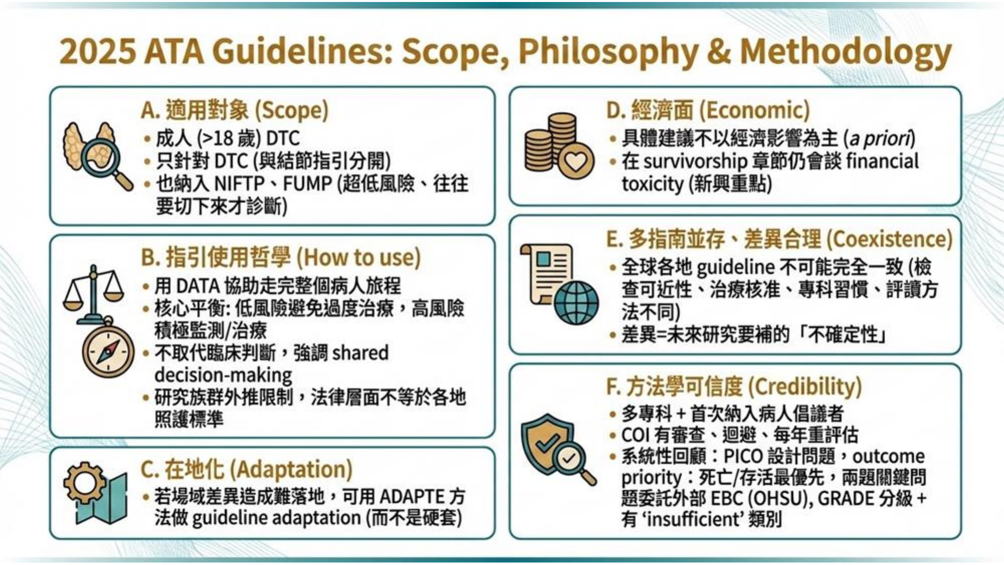 - 在地化 (Adaptation): 指引強調需根據不同地區的醫療資源與經濟條件進行調整,不強調單一指引為黃金標準 (Gold Standard),而是允許多指南並存。