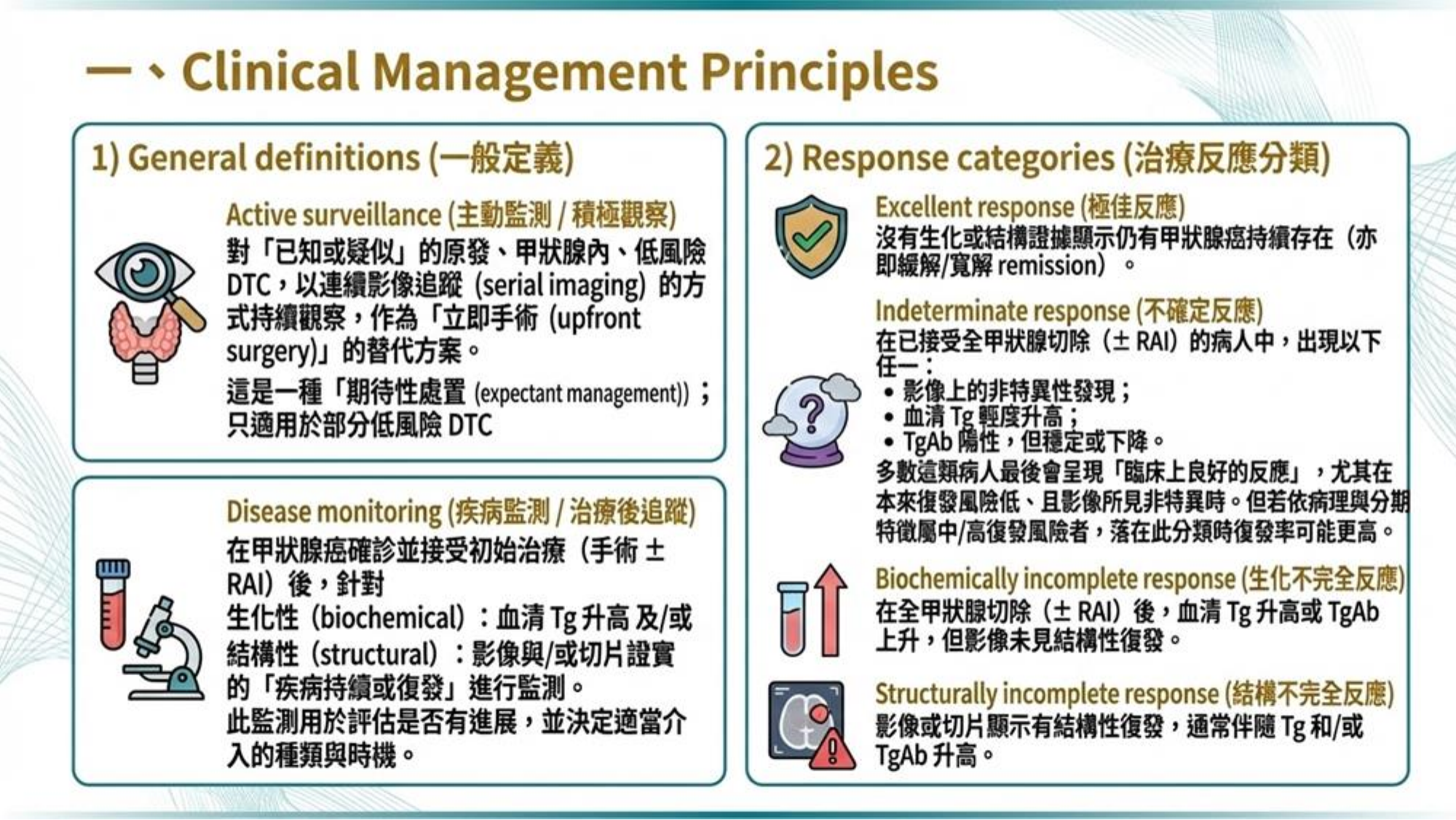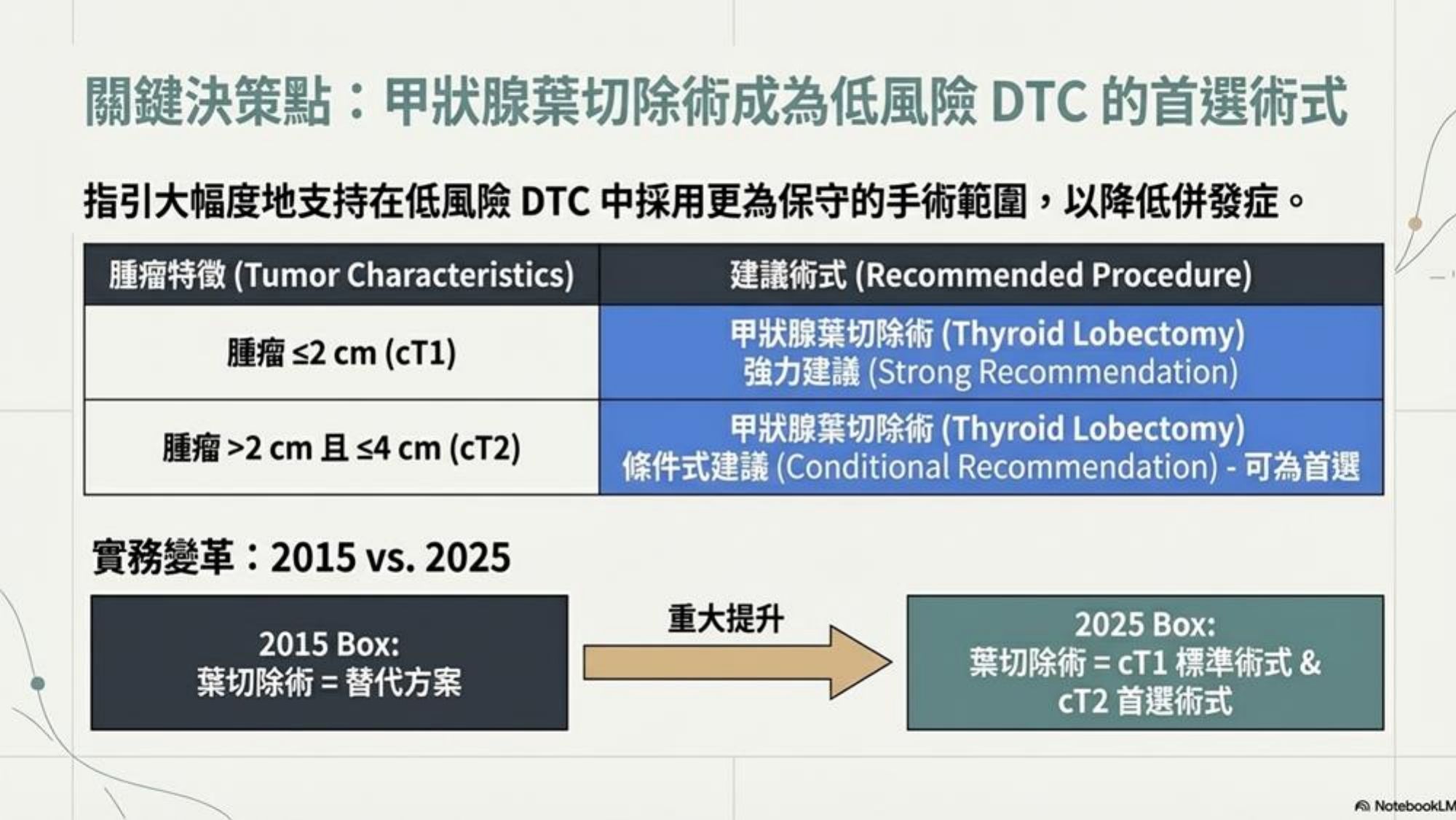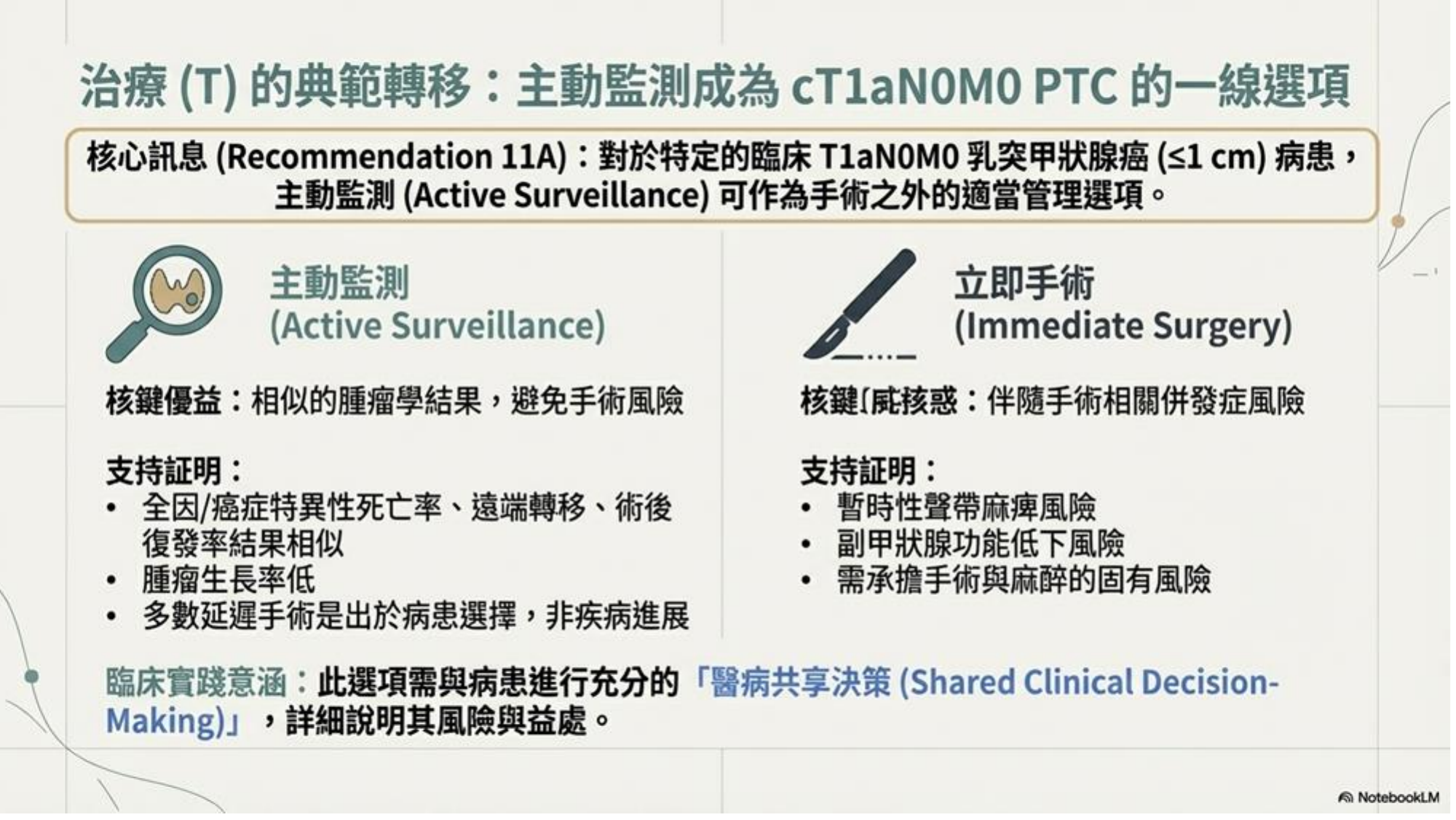 - 降階治療: 手術範圍縮小 (Lobectomy 適用 T2)、RAI 使用減少、主動監測 (AS) 角色提升。