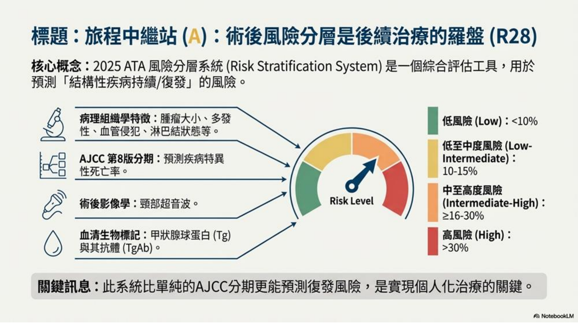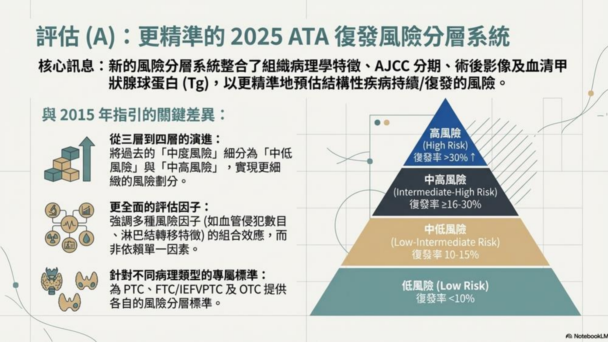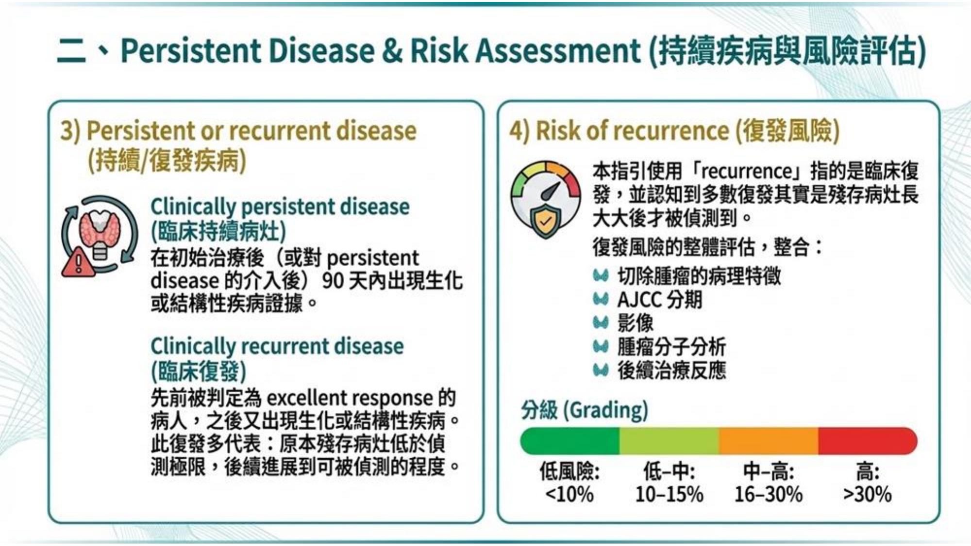 Slides 延伸說明 - 復發風險分級 (Risk of Recurrence): 復發風險依據病理特徵、AJCC 分期、影像學及分子分析分為四級:低 (Low, <10%)、中低 (Low-Intermediate, 10-15%)、中高 (Intermediate-High, 16-30%)、高 (High, >30%)。