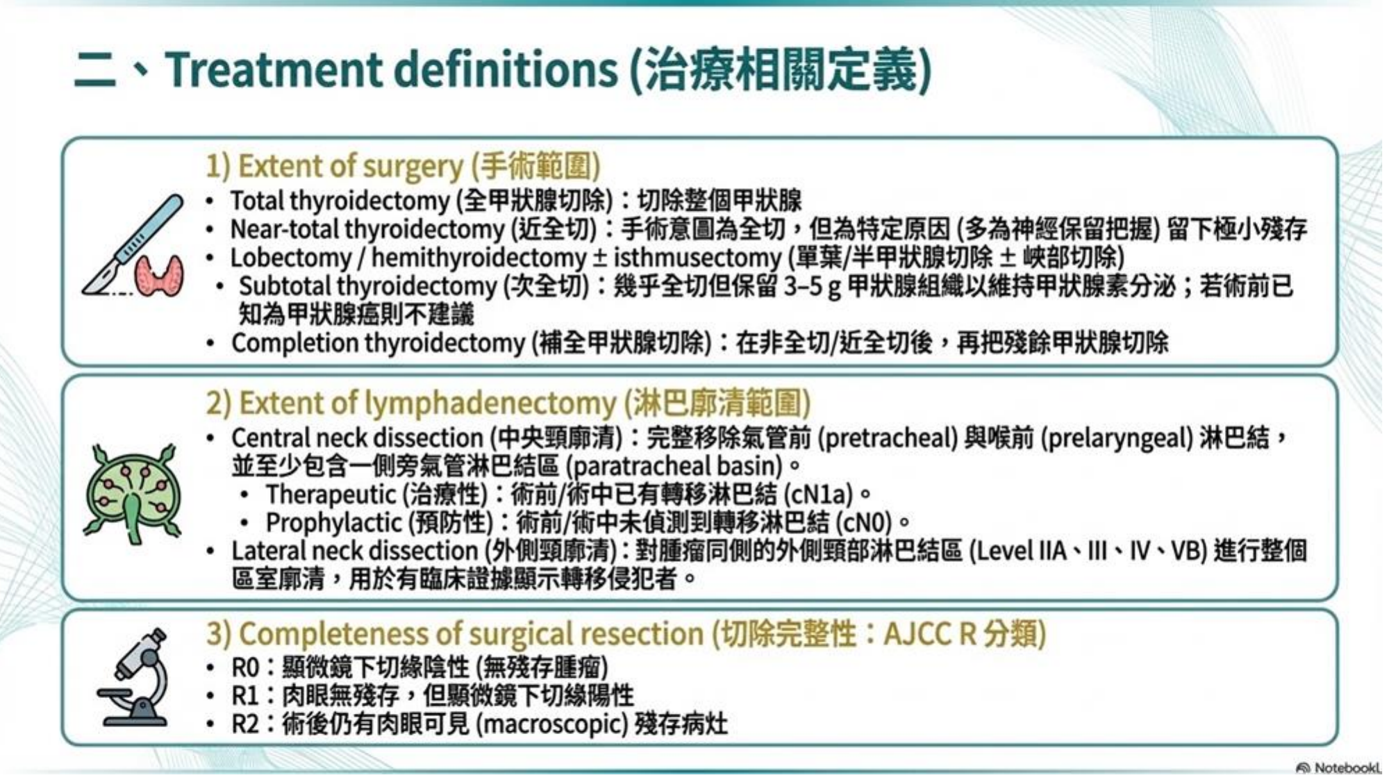 - 風險: 若切完發現病理結果不如預期 (如高風險特徵),可能需要進行補救手術 (Completion Thyroidectomy) 切除剩餘甲狀腺。