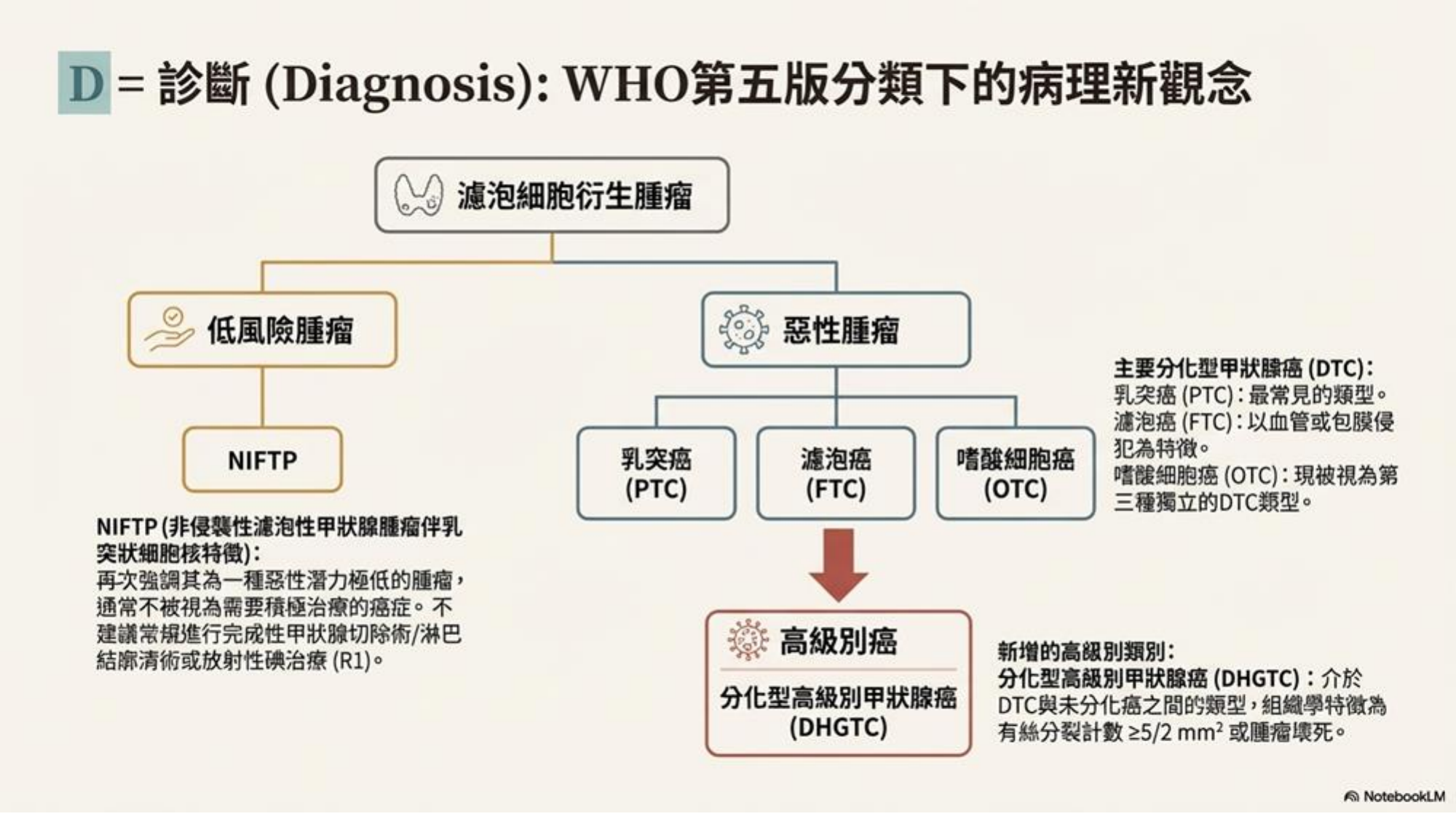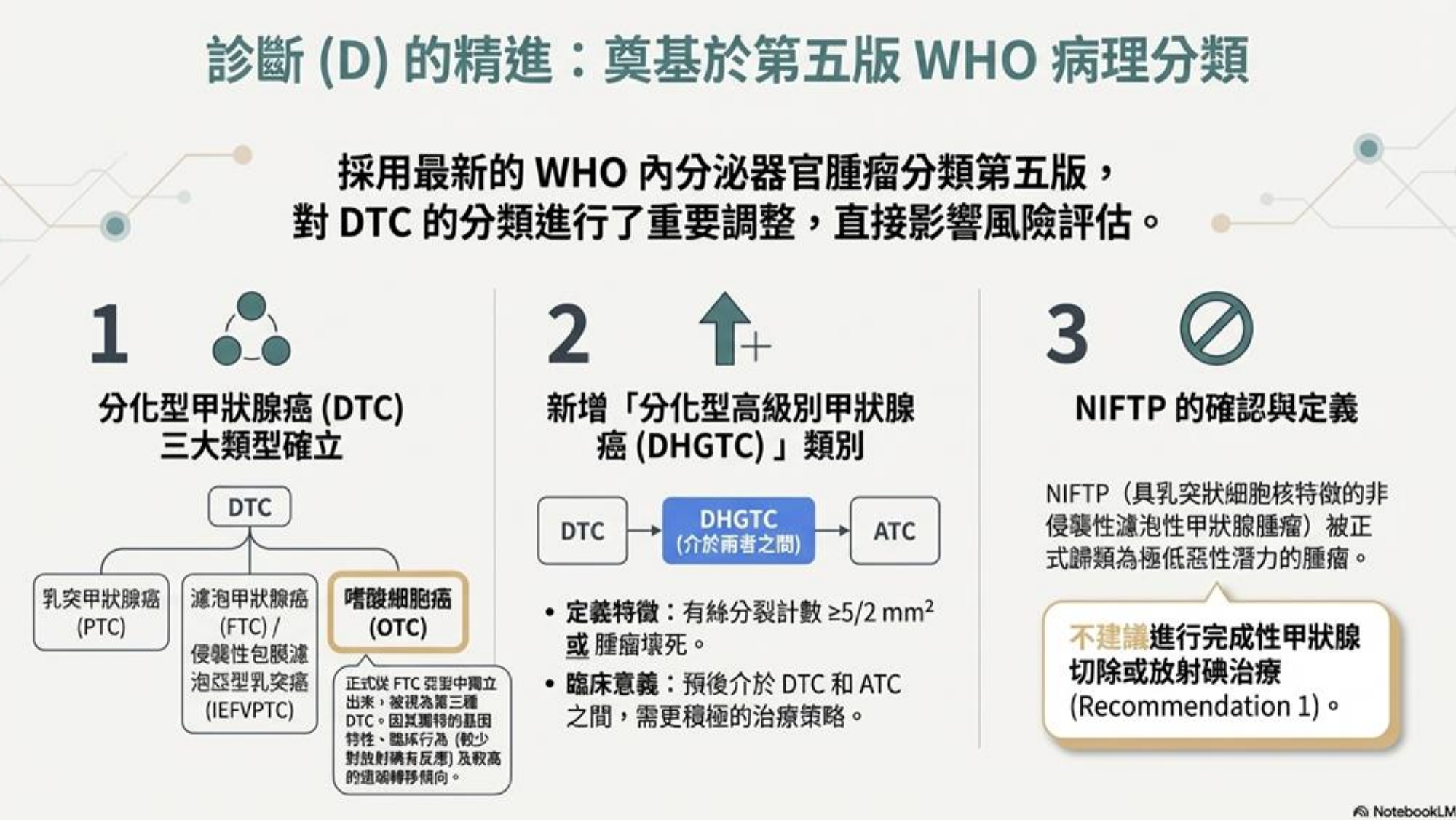 以往 DTC 主要分為 PTC (乳突癌) 和 FTC (濾泡癌)。2025 版指引依據 WHO 第五版分類,做出了重大改變: