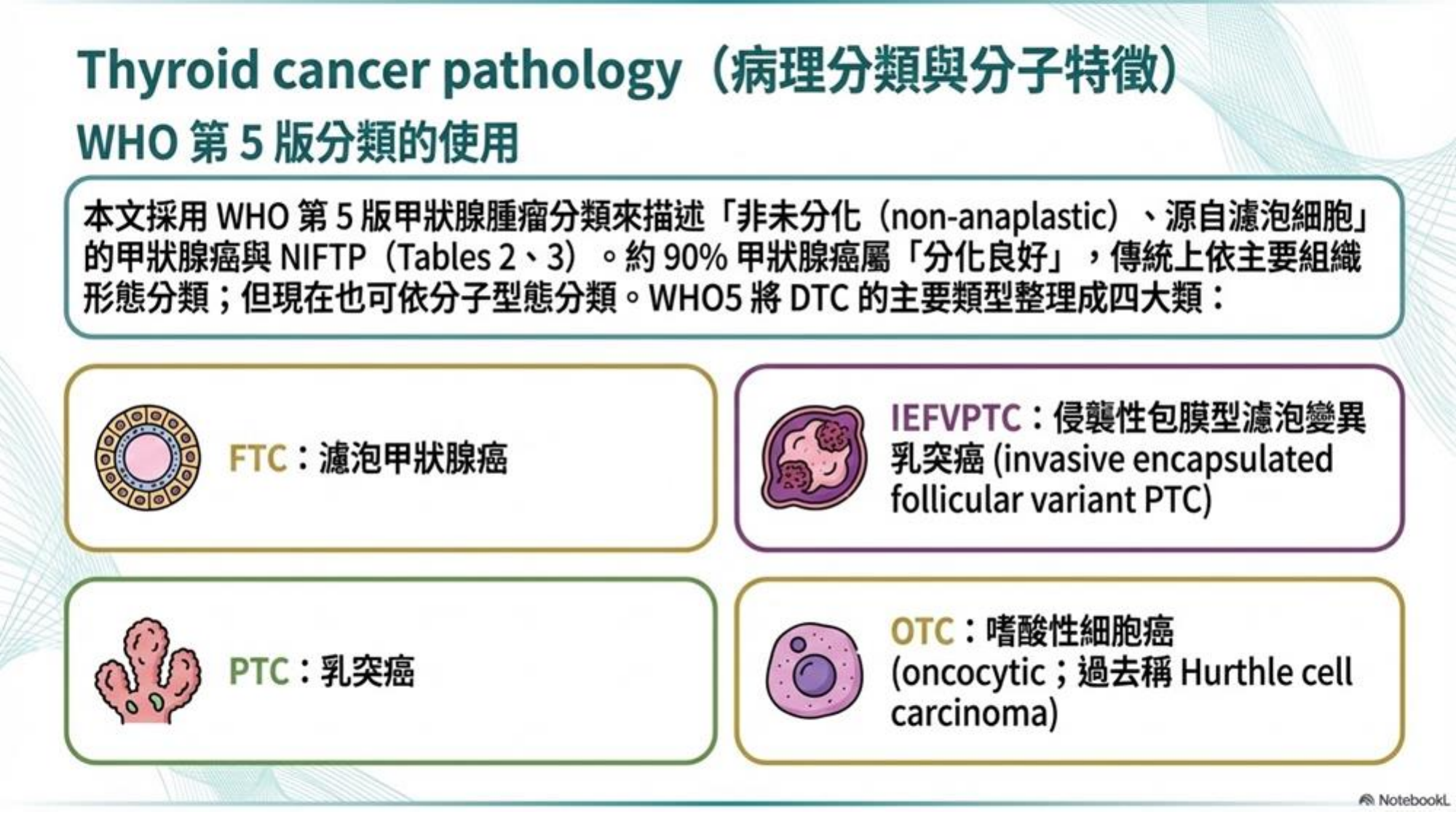 - DTC (分化型甲狀腺癌) 概況: 這是本次指引的重點,包含乳突癌 (Papillary) 與濾泡癌 (Follicular),佔了所有甲狀腺癌的 90% 以上。