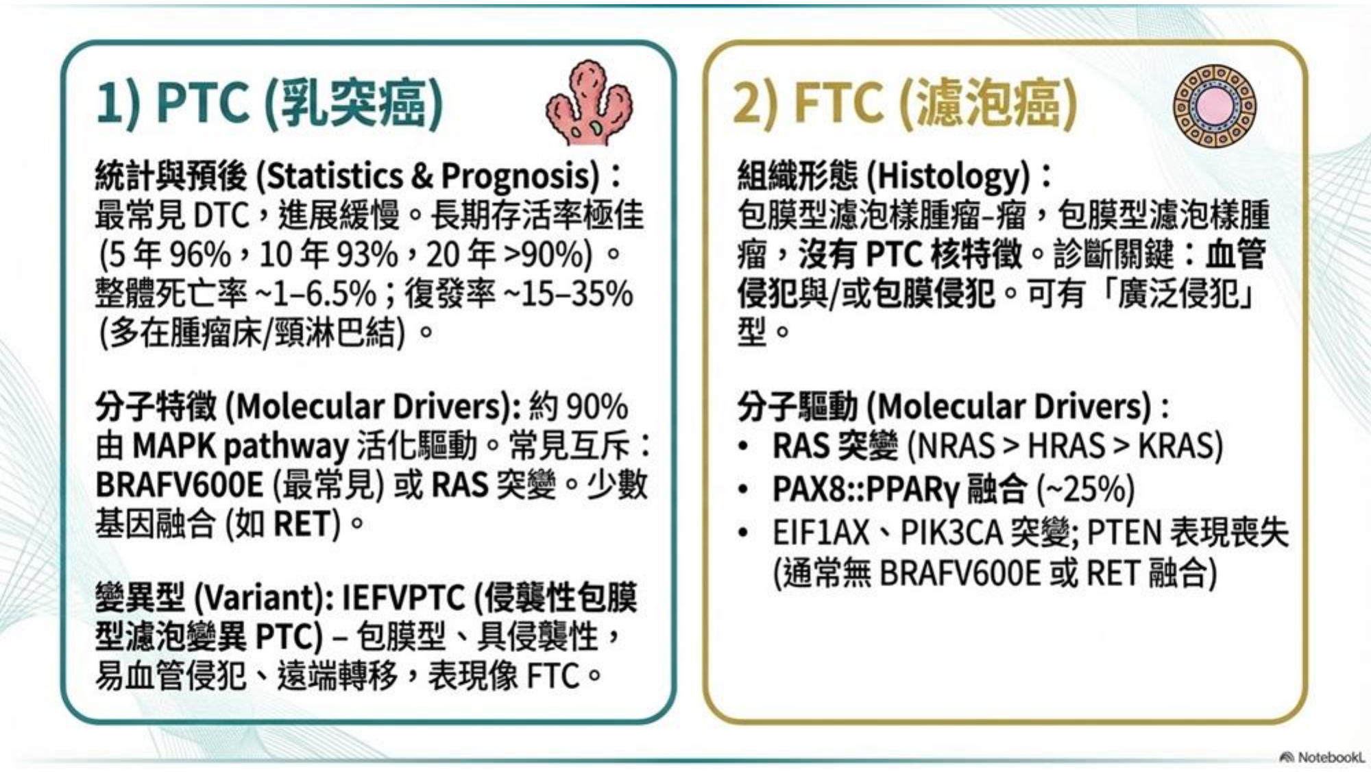 - PTC (Papillary Thyroid Carcinoma): 最常見 (>90%),生長慢,預後佳。分子特徵:BRAF V600E (主要)、RAS mutations、RET fusions。