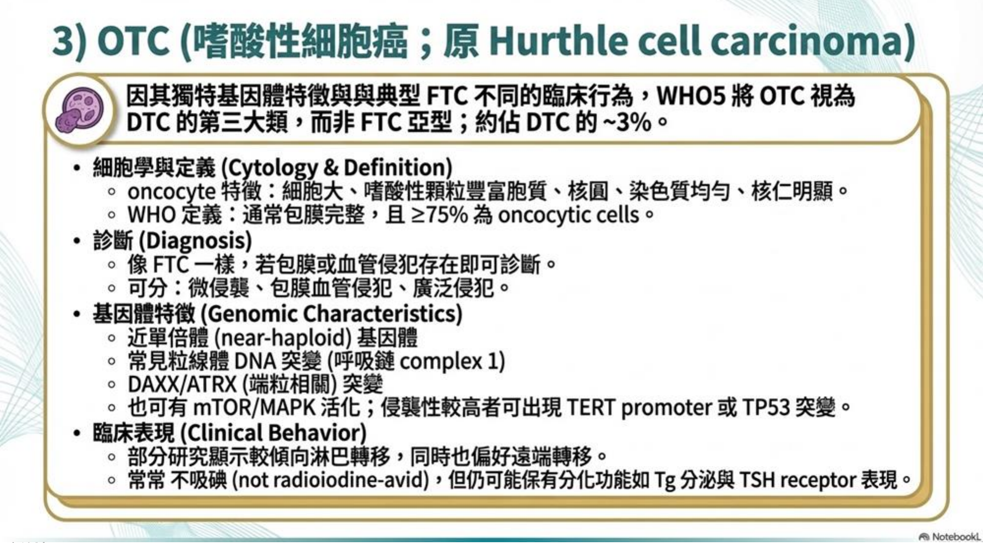 - 新獨立分類: 以前歸類在 FTC 下 (Hurthle cell),現在因為基因特色(粒線體 DNA 突變、近單倍體基因體)與高轉移傾向,被獨立出來。
