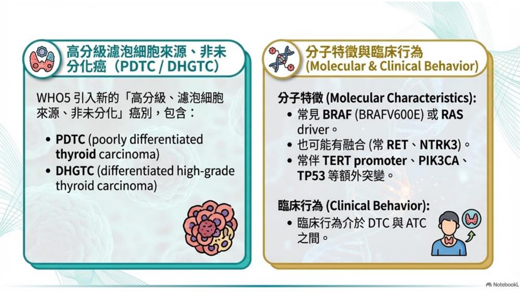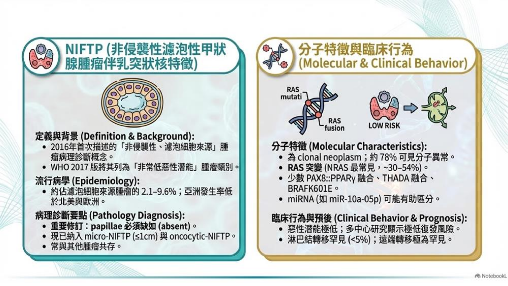 - 處置: 不建議全切除或做放射碘治療。分子特徵多為 RAS mutations。