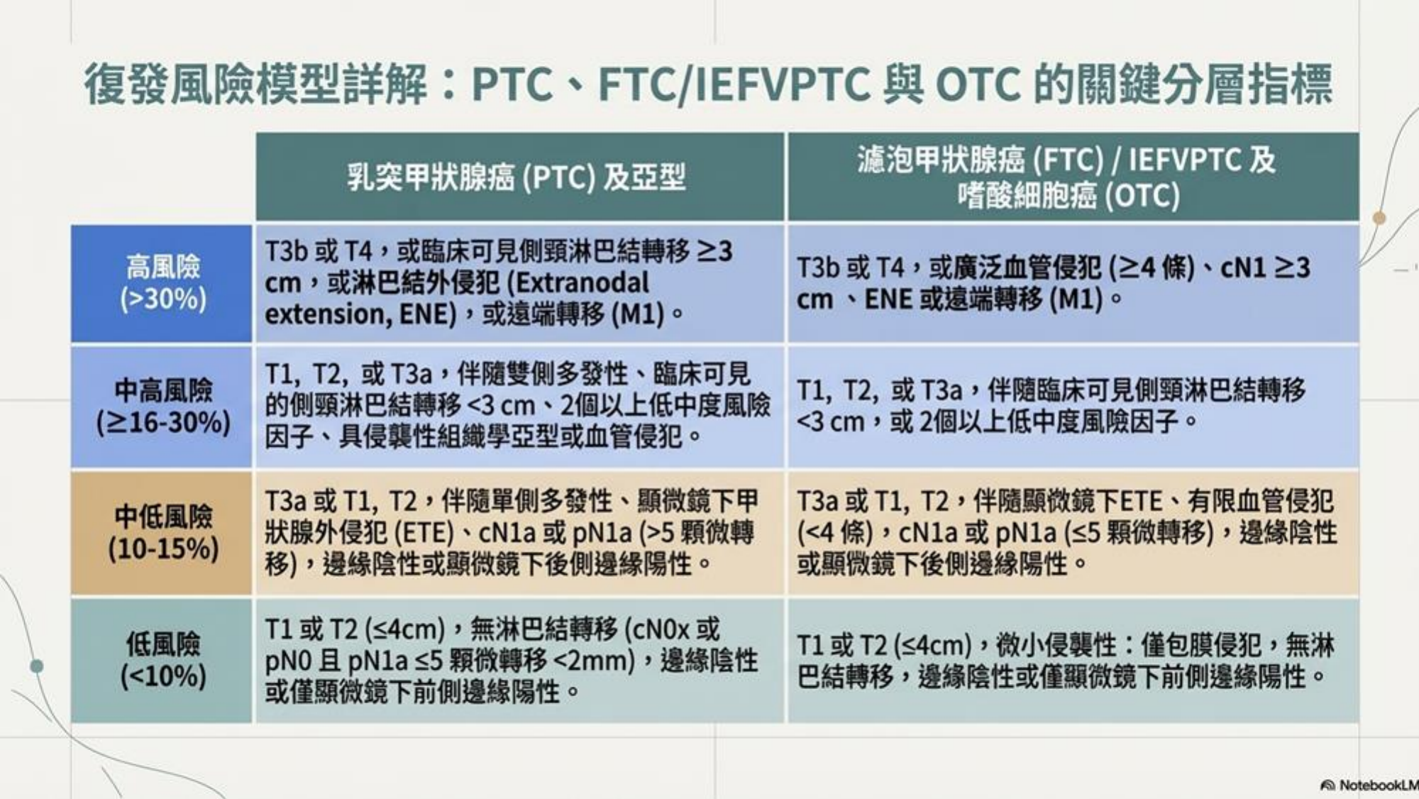 - High Risk: T3b, T4, 淋巴結 ≥3cm (N1 ≥3cm), 巨觀甲狀腺外侵犯 (Gross ETE), 遠端轉移 (M1)。