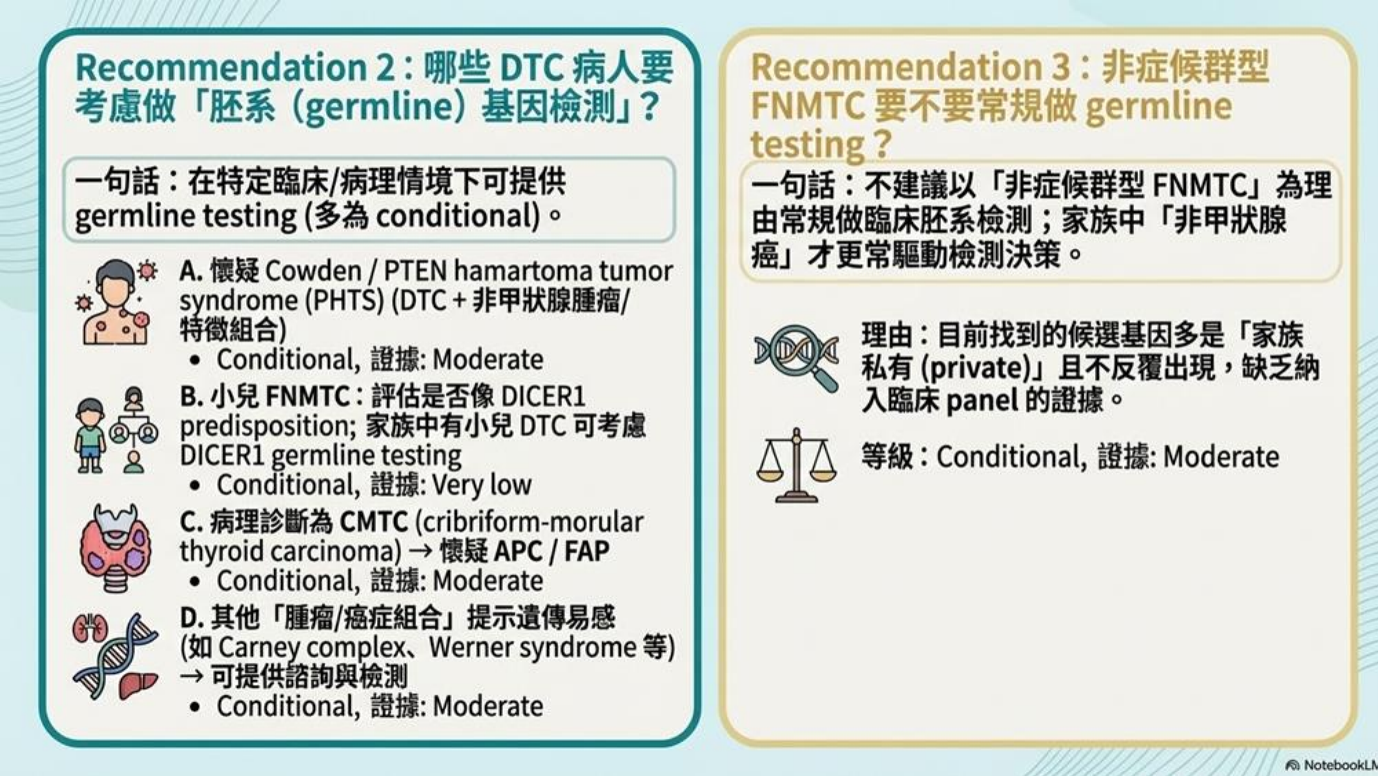 - 建議情況: 懷疑有遺傳性疾病 (如 Cowden syndrome, FAP 等) 才需考慮。(Slides: 證據等級 Moderate, 推薦等級 Conditional)。