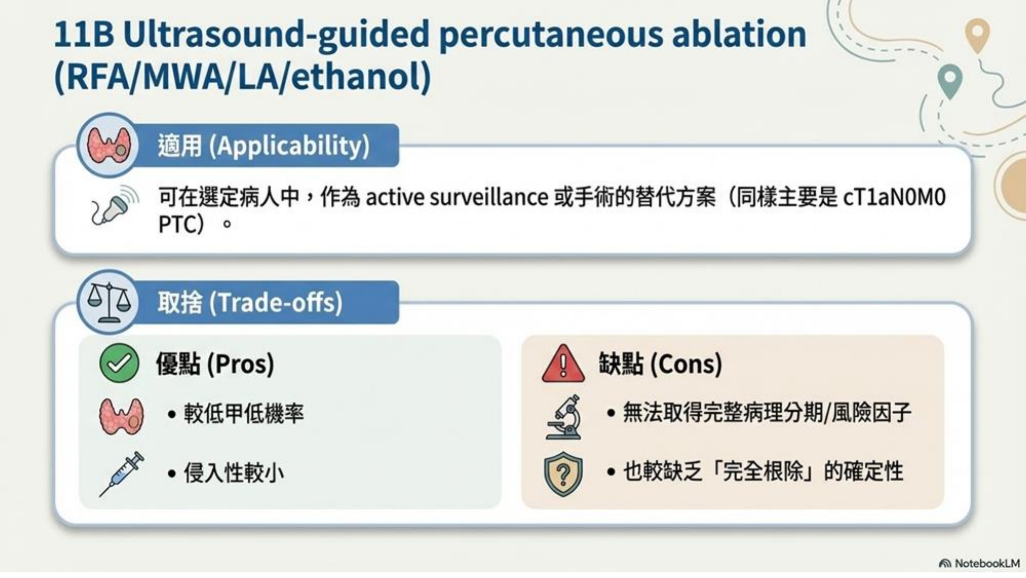 - 適用對象: 低風險 (如 cT1aN0M0 PTC <1cm)、病人意願抗拒手術、或手術風險高者。