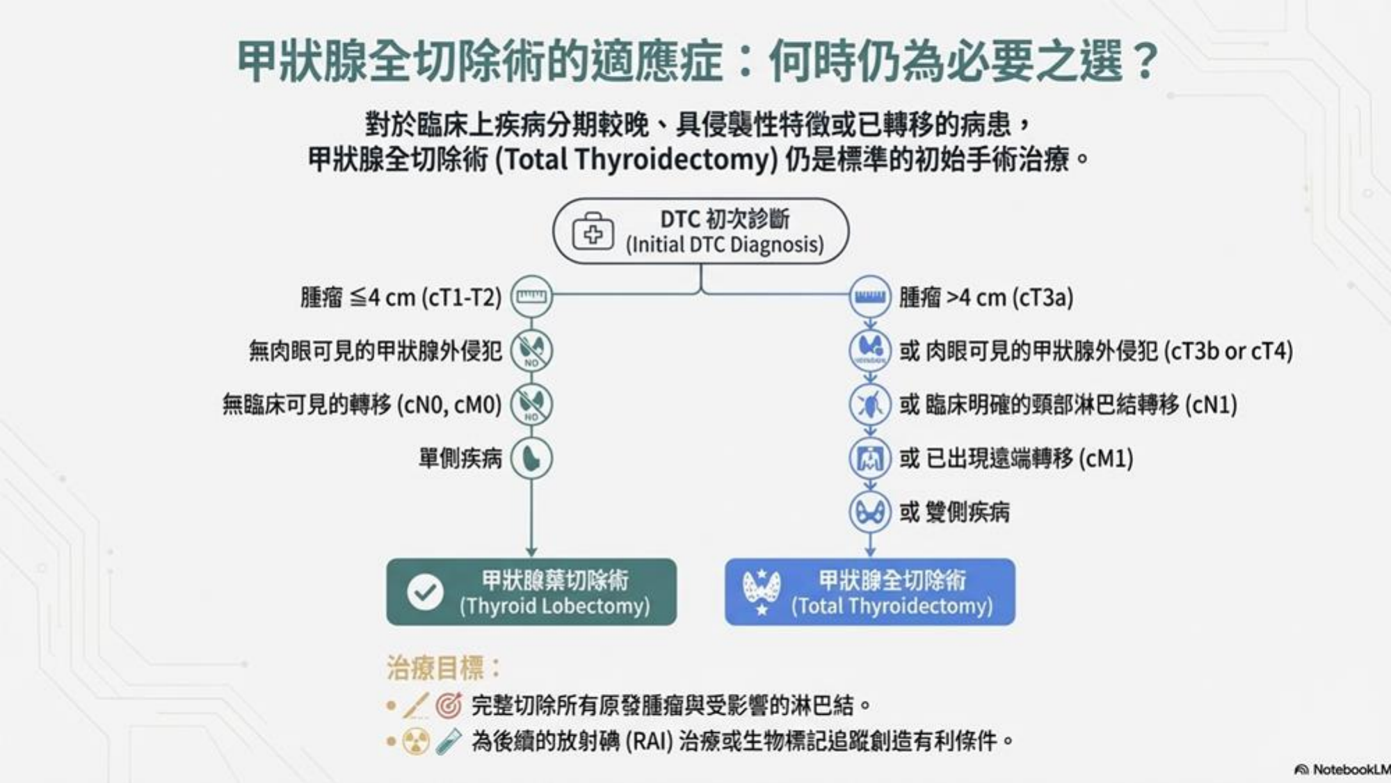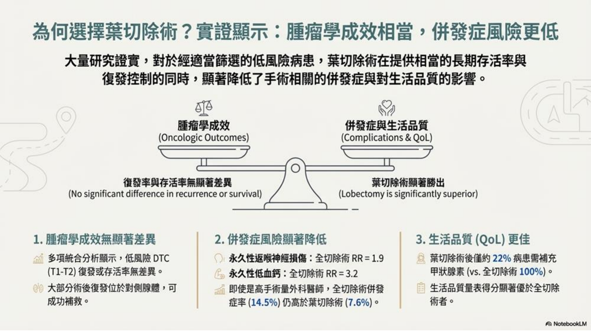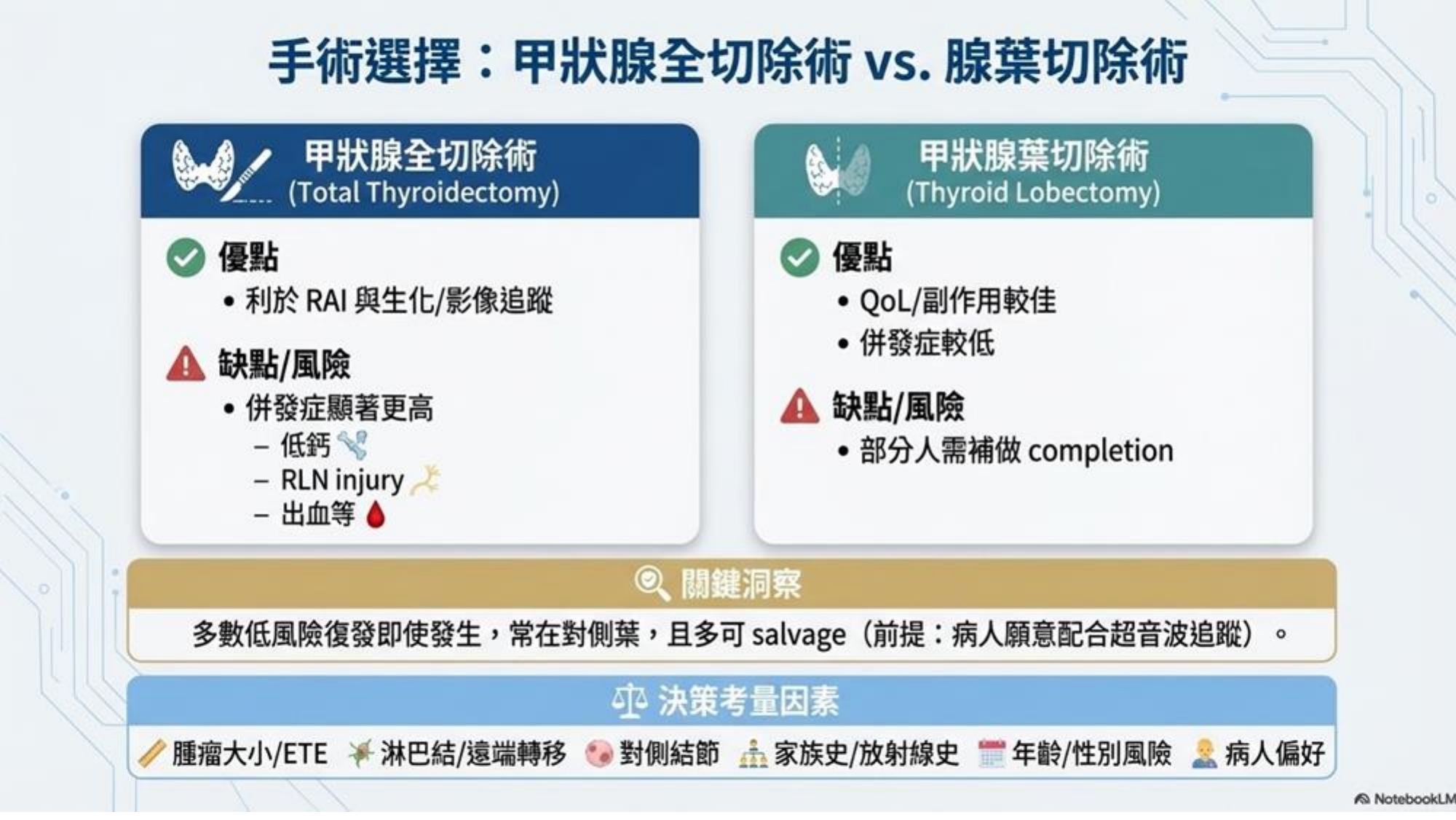 - 優點: 存活率與全切除相當,但併發症 (喉返神經受損、副甲狀腺低下) 顯著較低。