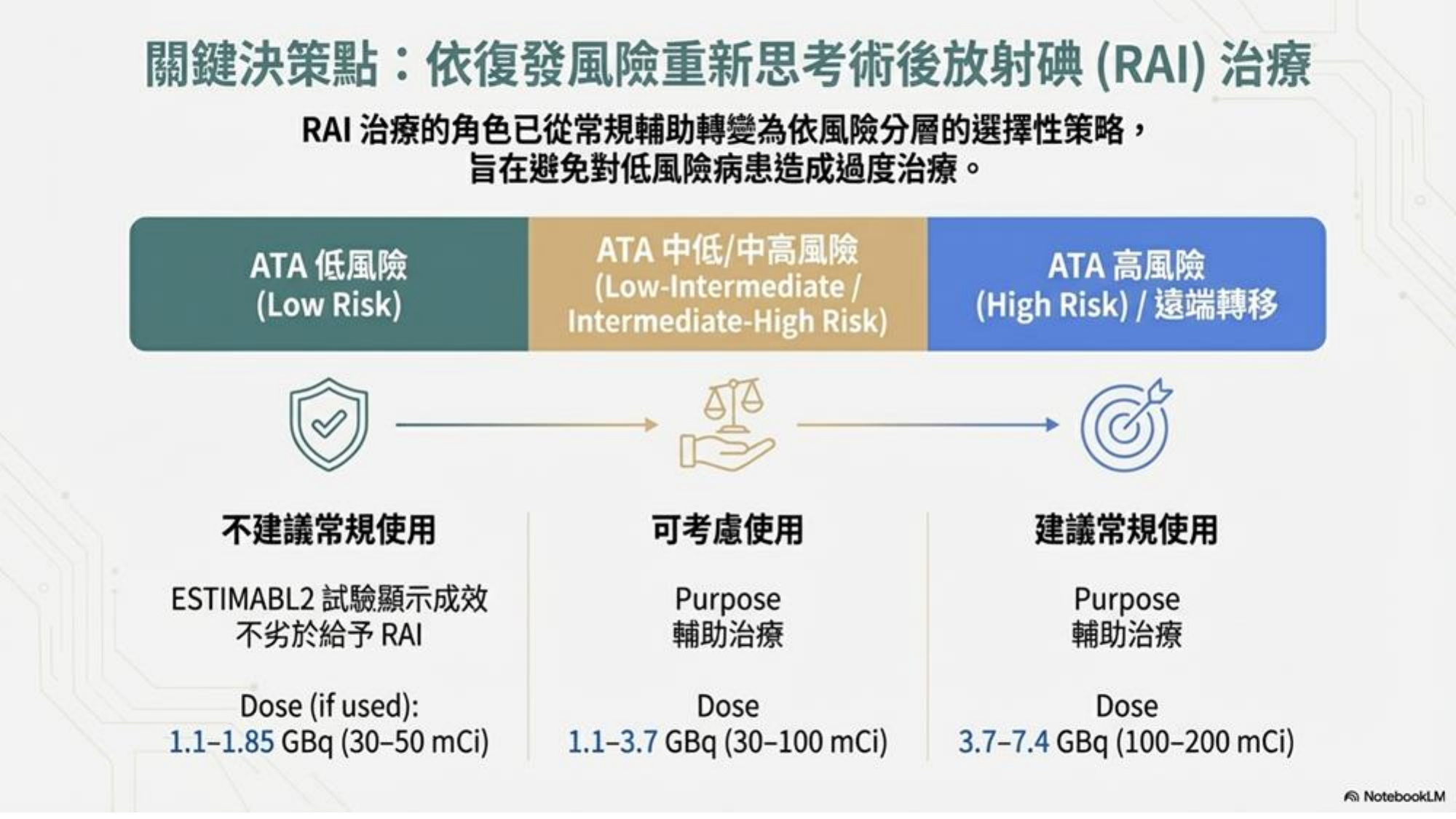- 低/中風險輔助治療:30-100 mCi (1.1-3.7 GBq)。