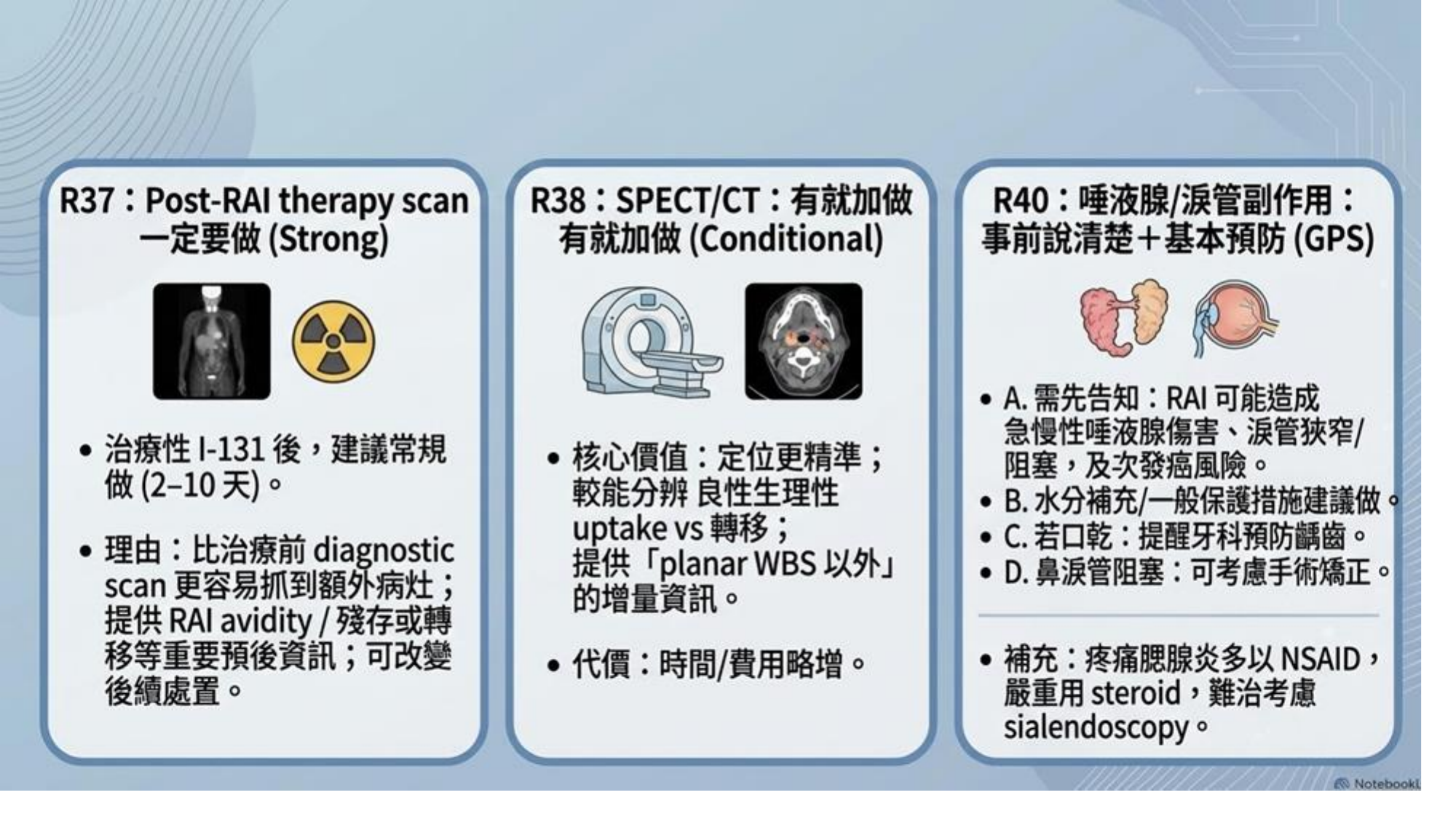 - rhTSH (人工TSH): 效果與停藥相當,生活品質較好,為優選。